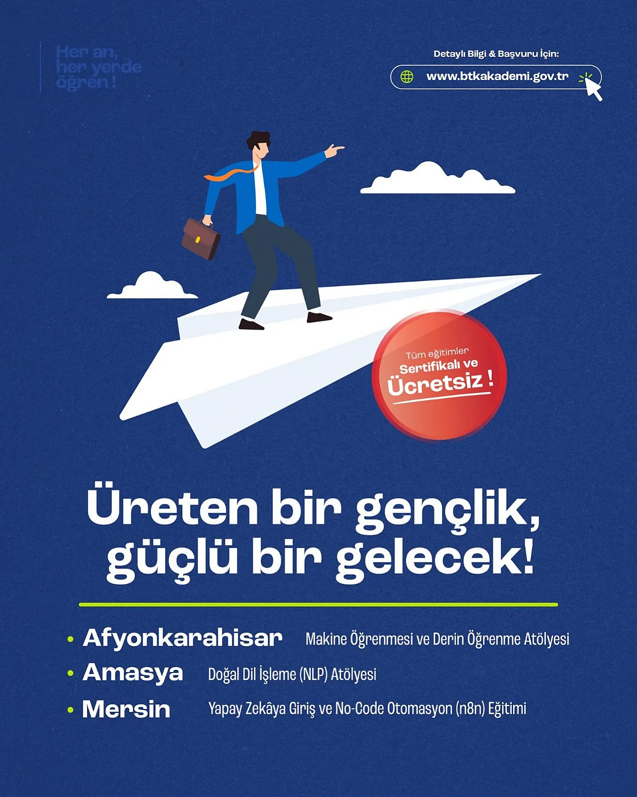 Bilgi Teknolojileri ve İletişim Kurumu’nun eğitim programı olan BTK Akademi, Afyonkarahisar’da 21 Şubat 2026-19 Mart 2026 tarihleri arasında 70 saatlik bir eğitim planladı. Uygulamalarla Makine Öğrenmesi ve Derin Öğrenme Atölyesi adını taşıyan eğitim, 30 yaş altı gençlerin başvurusuna açık. Gençler, bu eğitime katılmak için 11 Şubat 2026 tarihine kadar BTK Akademi’nin internet sitesinden müracaat edebilecek.