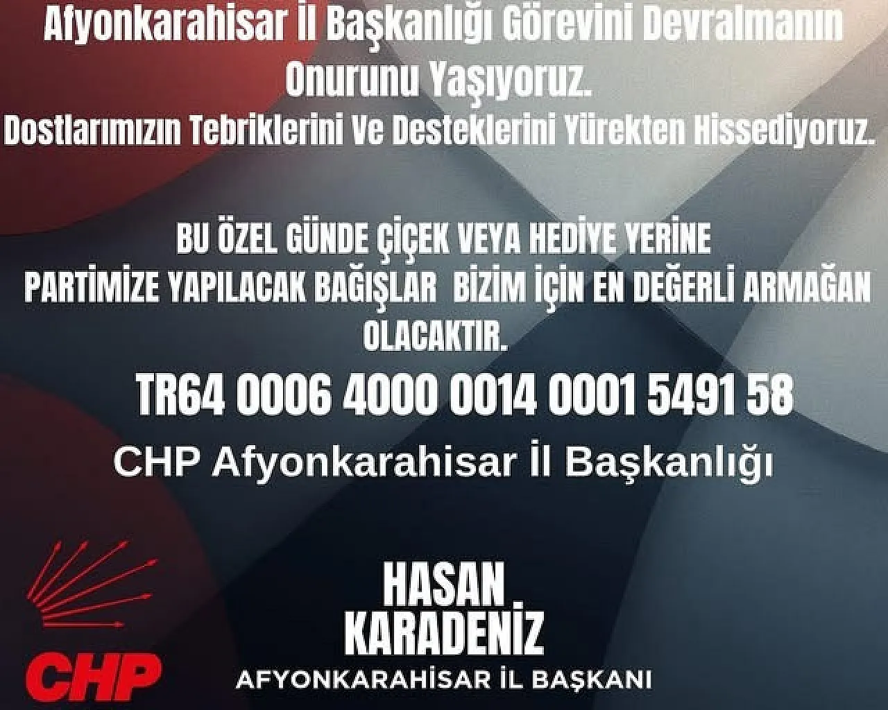 CHP Afyonkarahisar İl Başkanı Hasan Karadeniz, yeni yönetim kurulu üyeleri olarak dostlarından tebrik çiçeği ve hediye gönderimi yerine partiye bağış yapılması talebinde bulundu.