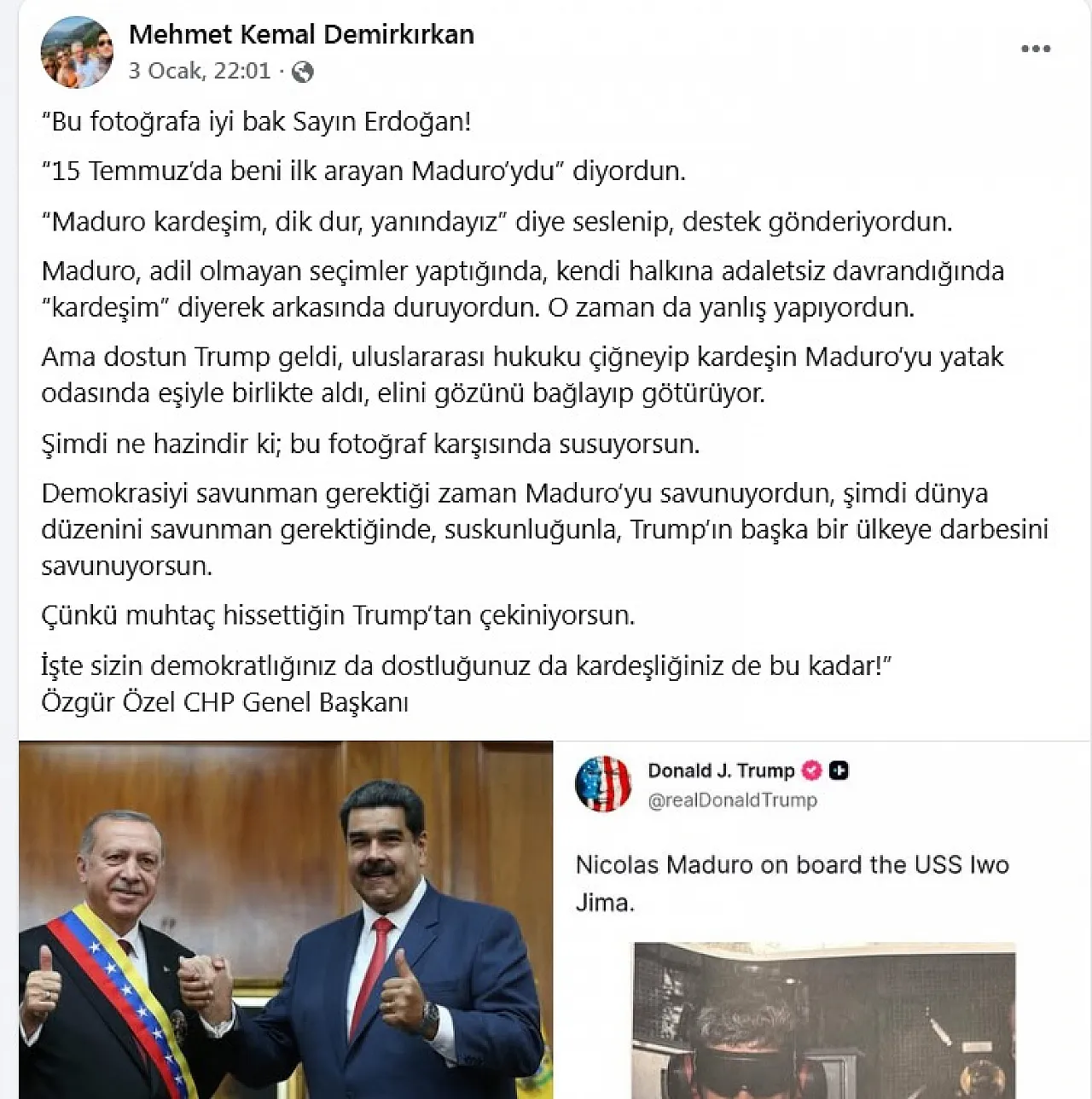 Demirkırkan’ın paylaşımı, demokrasi savunusu değil; uluslararası bir krizi iç siyaset malzemesi hâline getirme gayretidir. CHP’li Demirkırkan’ın, yaptığı bu paylaşımın kendi cenahları içerisinde dahi rahatsızlıklara neden olduğu görülmektedir. Demirkırkan’ın söz konusu paylaşımı, bir marifetmiş gibi sunması ayrıca düşündürücüdür. Bu tutum, her ne kadar fikir ayrılıkları olsa da, dış aktörler söz konusu olduğunda, iç muhalefetin kenara bırakılarak aynı bayrak altında toplanmayı bilen CHP’li seçmene yönelik de açık bir saygısızlıktır. Gazi Mustafa Kemal Atatürk’ün ‘Yurtta sulh, cihanda sulh’ ilkesini dilinden düşürmeyenlerin; bugün başka ülkelerin iç işlerine yapılan hukuksuz müdahaleleri görmezden gelerek Türkiye’yi suçlaması büyük bir çelişkidir. Ana muhalefet partisinin temsilcilerine yakışmayan bu üslup, ne demokrasiye ne de Cumhuriyet değerlerine hizmet etmektedir. Türkiye Cumhuriyeti, sosyal medya paylaşımlarıyla yönlendirilecek bir devlet değildir. Sayın Cumhurbaşkanımız, dün olduğu gibi bugün de hiçbir küresel gücün gölgesine sığınmadan, milletinin ve devletinin onurunu korumaya devam etmektedir. Milletimiz, kimin devlet ciddiyetiyle konuştuğunu, kimin siyasi fırsatçılık peşinde olduğunu açıkça görmektedir. Kemal Demirkırkan’ın, bu paylaşımı ne yazık ki, siyasi basiretsizliğin bir örneği olarak kayda geçmiştir.”