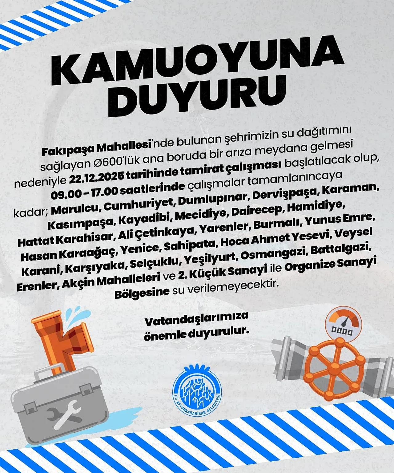 Afyonkarahisar Belediyesi'nden yapılan duyuruya göre Fakıpaşa Mahallesi'nde bulunan şehrimizin su dağıtımını sağlayan 600'lük ana boruda arıza meydana gelmesi nedeniyle yarın (22 Aralık Pazartesi) çalışma yapılacak.