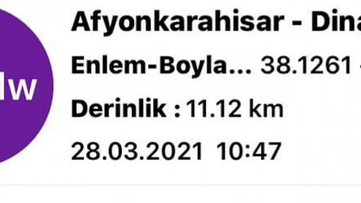 İçişleri Bakanlığı Afet ve Acil Durum Yönetimi Başkanlığı Deprem Dairesi Başkanlığı’nın verilerine göre, merkez üssü Afyonkarahisar’ın Dinar ilçesi olan Richter Ölçeği’ne göre 3.6 büyüklüğünde deprem meydana geldi. 11.12 kilometre derinlikteki deprem saat 10.47’de kaydedildi. Çevrede hafif şekilde hissedilen deprem ilk belirlemelere göre hasara neden olmadı.