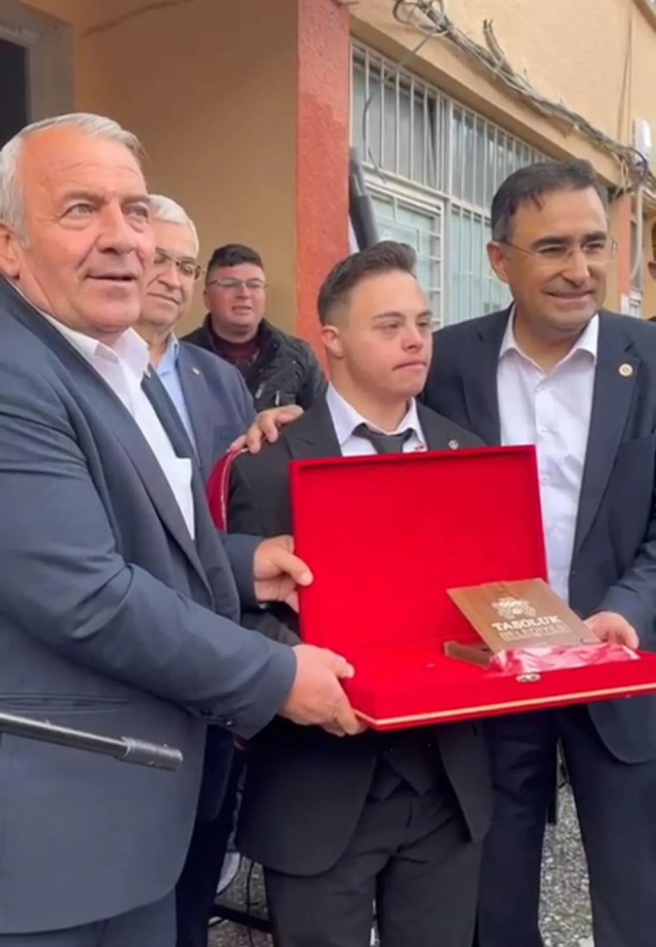 AK Parti Afyonkarahisar Milletvekili Dr. Hasan Arslan, Taşoluk beldesinde katıldığı asker uğurlama töreninde down sendromlu Rıza Özel'e Türk Bayrağı takdim etti.