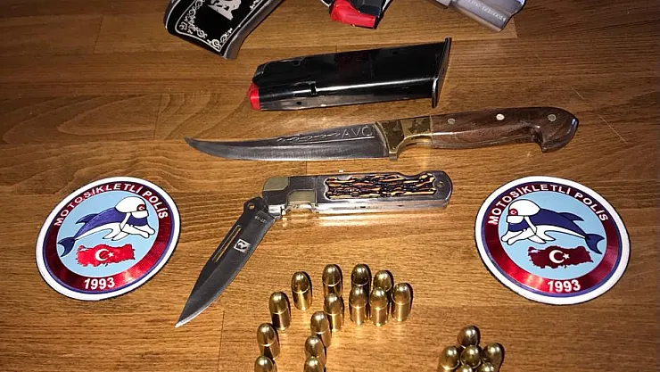 Araç polis takibe alınarak siren ve megafon marifeti ile 2. Küçük Sanayi arkası Özerband fabrikası önünde yakalandı. Araç şoförü olan Y .O isimli şahıstan 1 adet bulundurma ruhsatlı tabanca ve tabancaya ait 28 adet mermi, 1 adet maksat dışı bıçak, yolcu koltuğunda oturan S .K isimli şahsın üzerinden de 1 adet maksat dışı bıçak alınarak muhafaza altına alındı. Şahıslara trafik yönünden de 1050 TL para cezası uygulandı.