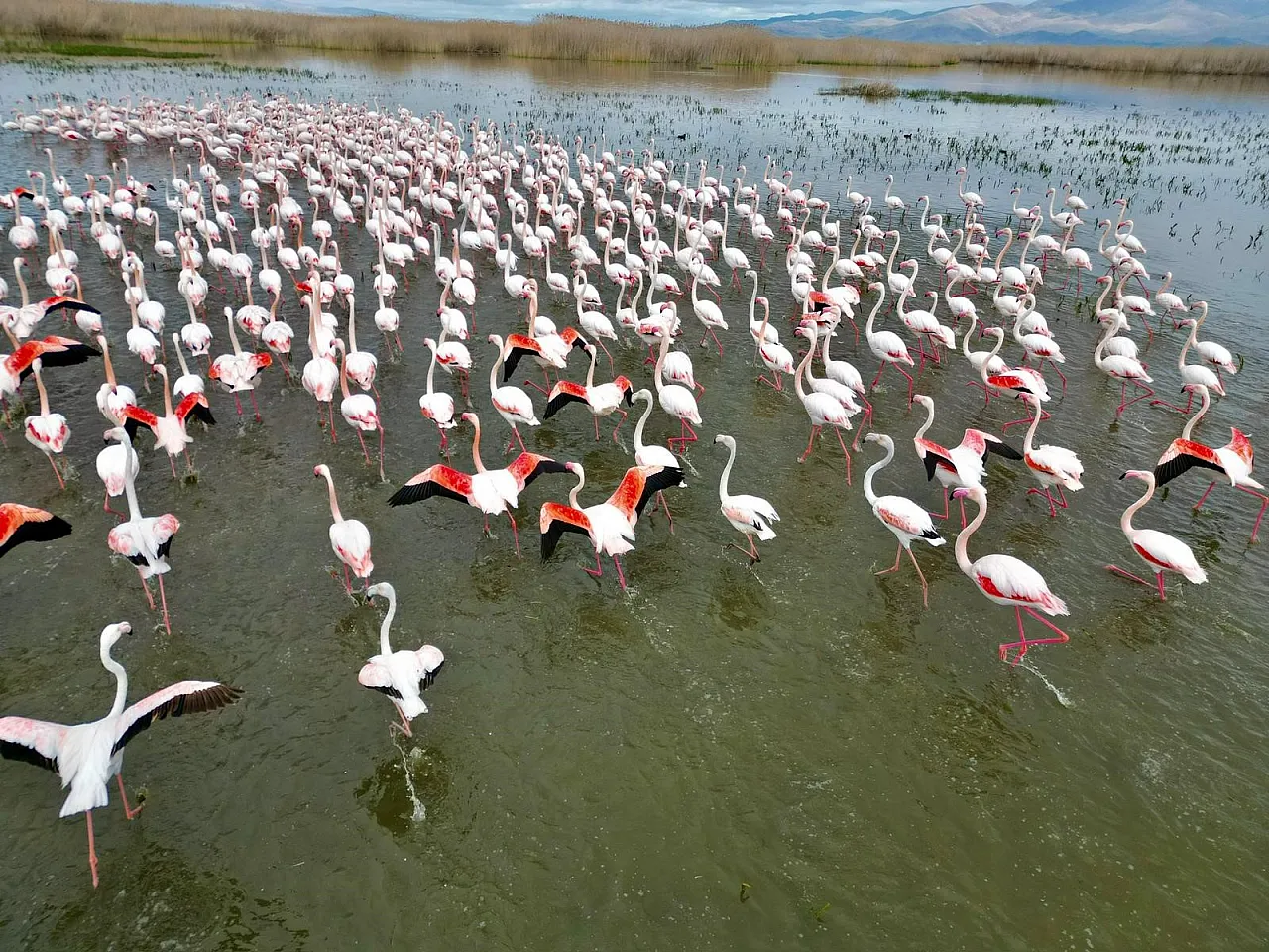 Her yıl belirli dönemlerde konaklamak için Eber Gölü’nü tercih eden flamingolar, gölün ekosistemi için de büyük önem taşıyor. Havadan çekilen görüntülerde gölün mavi sularıyla birleşen flamingo sürüleri, kartpostallık manzaralar oluşturdu. Bu nadir görülen manzara, bölgedeki doğal yaşamın zenginliğini bir kez daha gözler önüne sererken, gölde su seviyesinin de arttığı gözlemlendi.