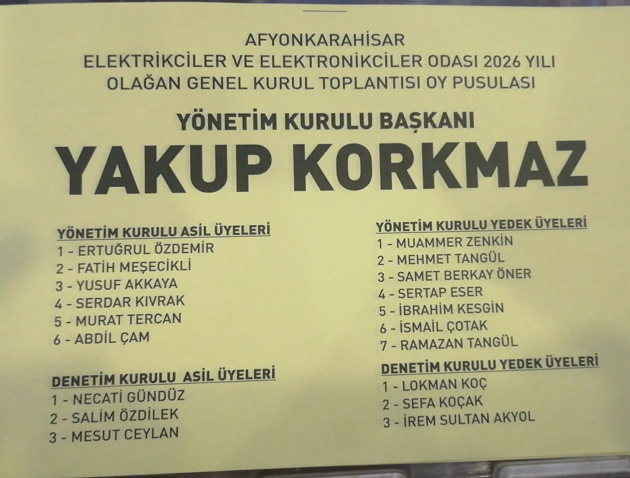 Afyonkarahisar Elektrikçiler ve Elektronikçiler Esnaf Odasının 2026 yılı olağan genel kurul toplantısı basına kapalı şekilde tamamlandıktan sonra seçime geçildi.
