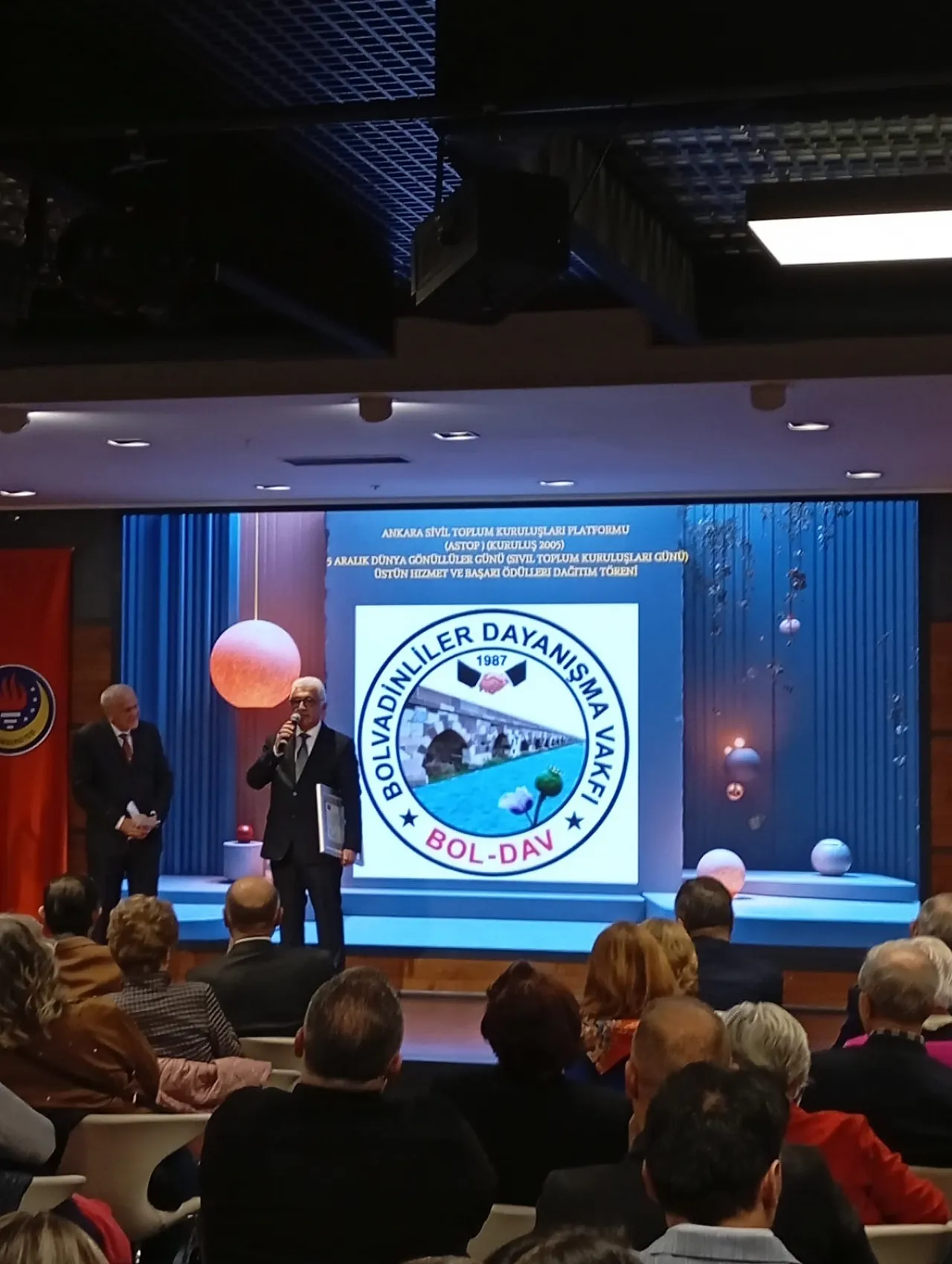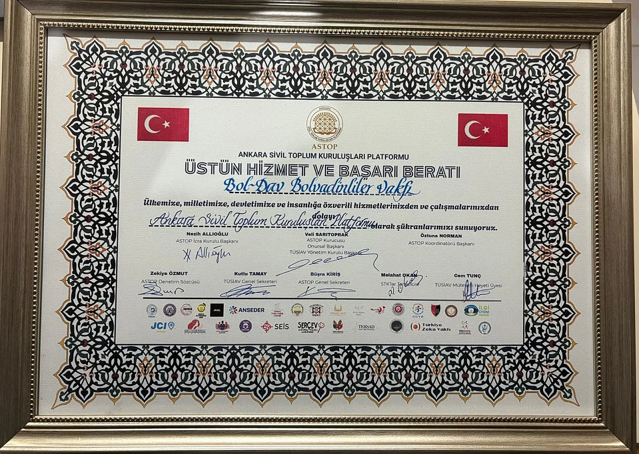 Bolvadinliler Dayanışma Vakfı (BOL-DAV) 5 Aralık Dünya Gönüllüler Günü (Sivil Toplum Kuruluşları Günü) dolayısıyla, Ankara Sivil Toplum Kuruluşları Platformu (ASTOP) tarafından Türkiye’ye, devlete ve insanlığa sunduğu özverili hizmetler dolayısıyla “Üstün Hizmet ve Başarı Beratı”na layık görüldü.