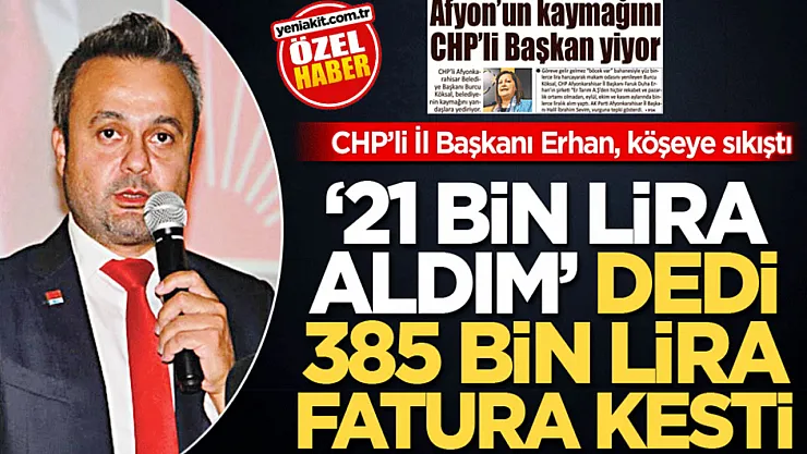 CHP Afyonkarahisar İl Başkanı Faruk Duha Erhan 'Afyon Belediyesi'ne sadece 21 bin TL'lik fatura kestim' demişti. Akit Gazetesi CHP İl Başkanı'nın Afyon Belediyesi'ne seçimden bu yana 385 bin TL'lik fatura kestiğini iddia etti