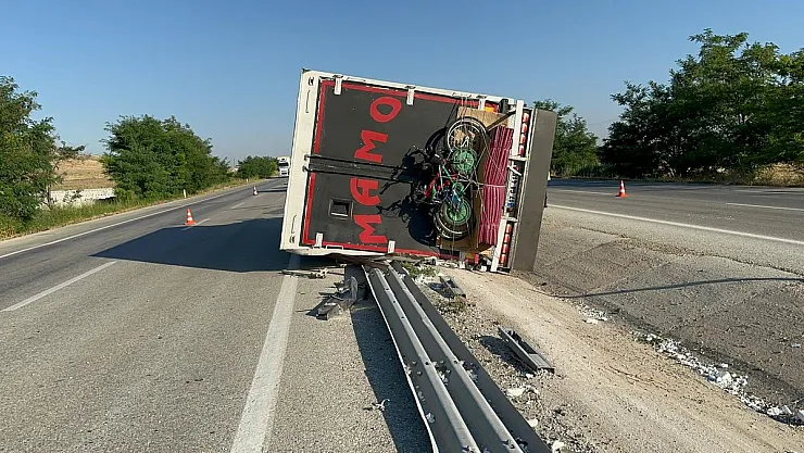 Afyonkarahisar'da kontrolden çıkarak bariyerleri yıkıp ardından yol ortasında refüje devrilen kamyonda 4 kişi yaralandı.