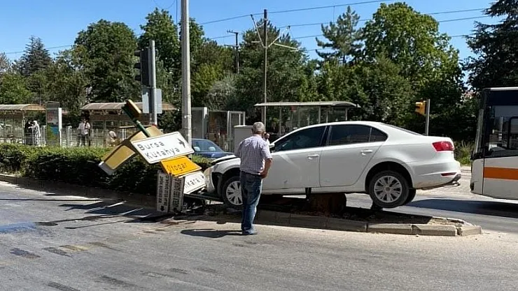 Eskişehir'de yola fırlayan çocuğa çarpmamak için ani manevra yaptığı iddia edilen otomobil, refüje çıkarak trafik levhasına çarptı.