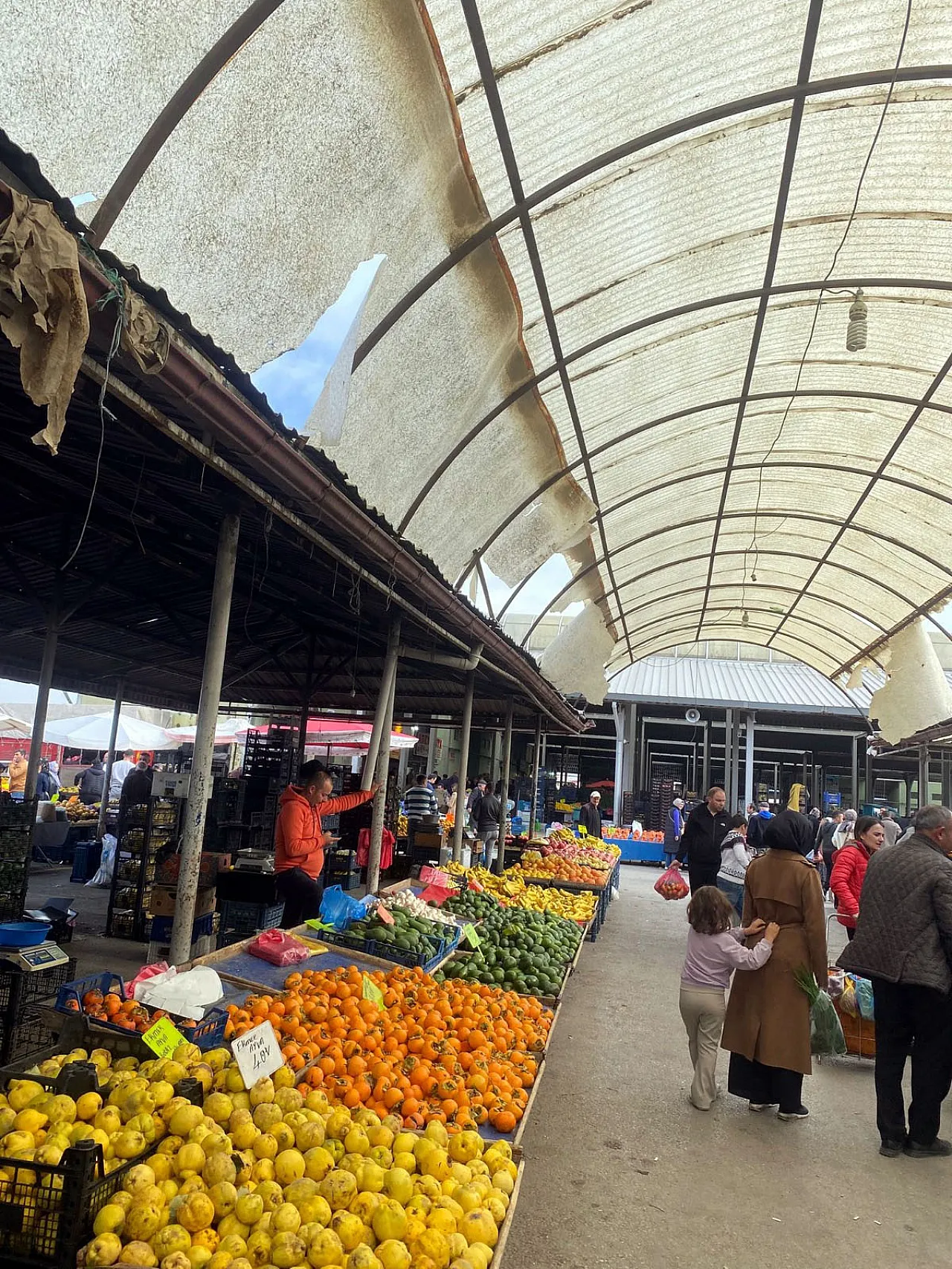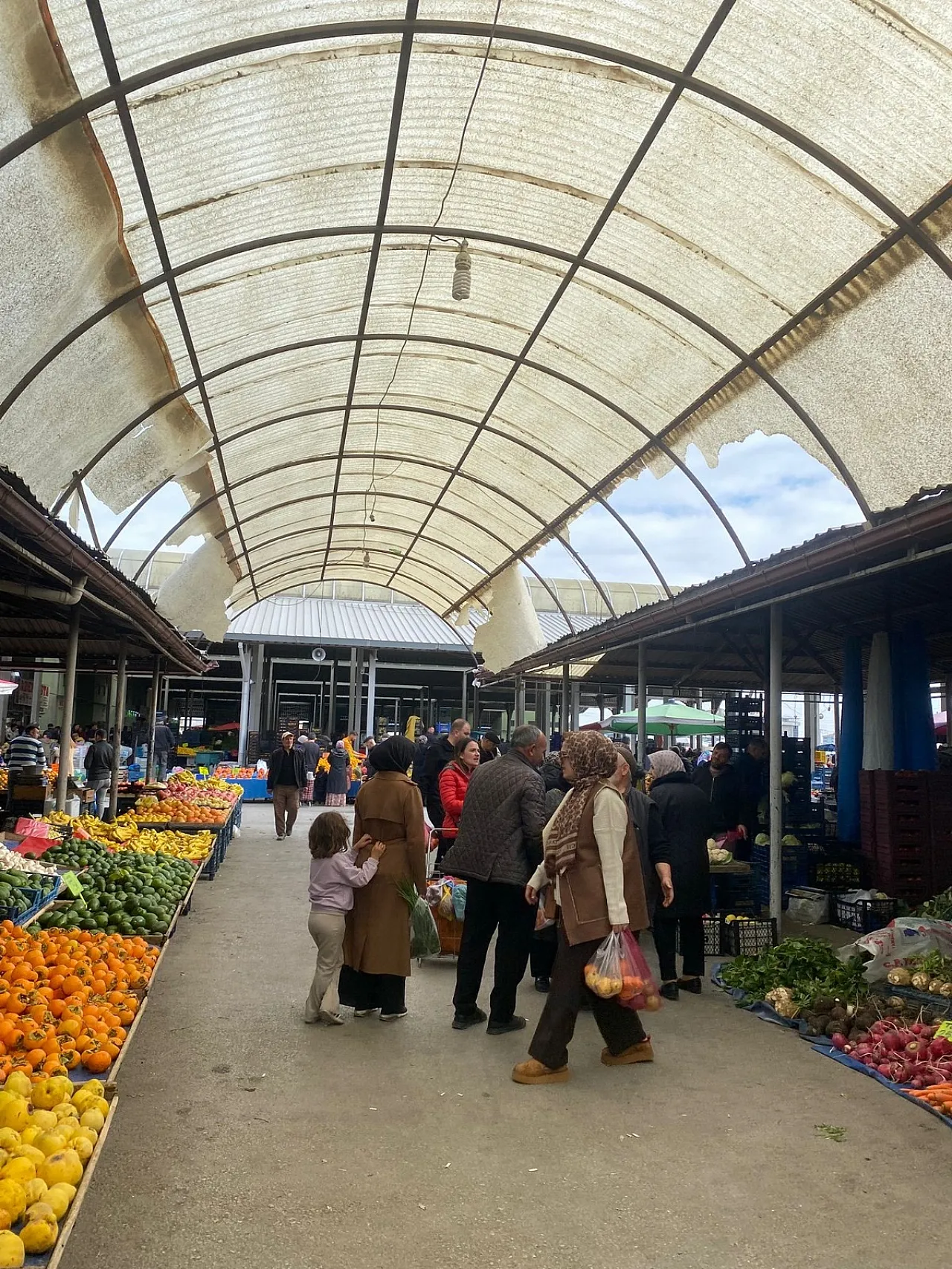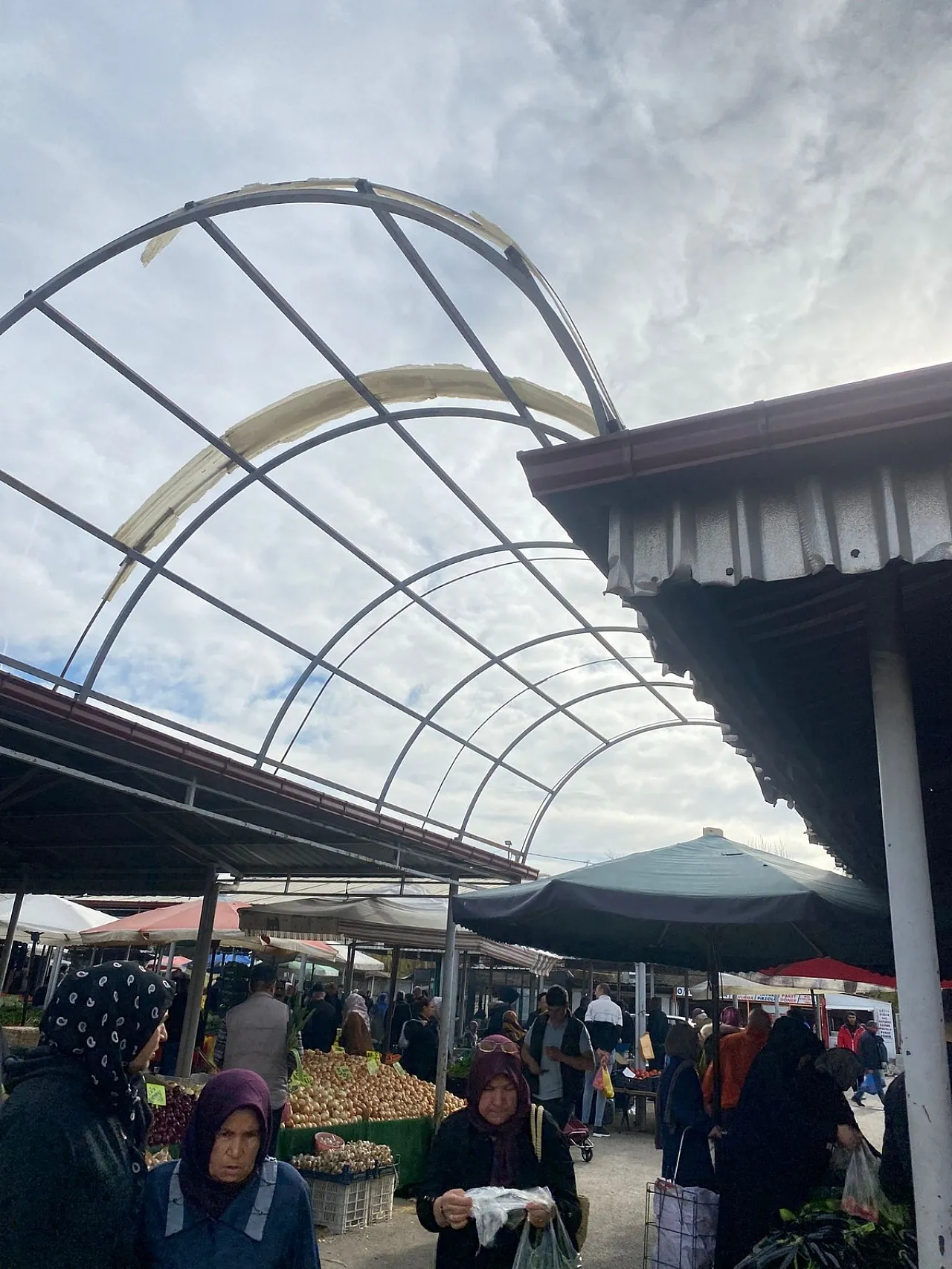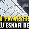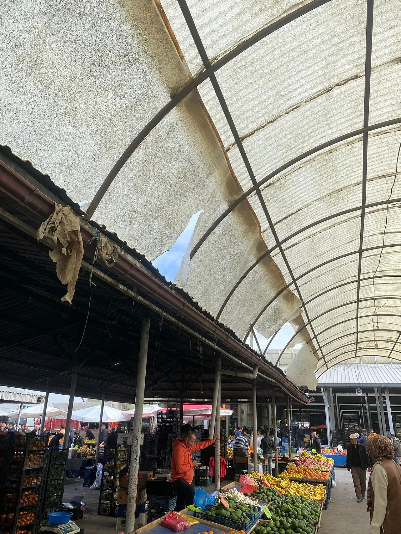 Fuar Alanı Pazaryerindeki köylü bölümünde tezgâh açan esnaflar ile alışveriş yapan vatandaşlar, çatı malzemeleri ve tentelerin parçalanmış olması sebebiyle büyük sıkıntı yaşıyorlar.