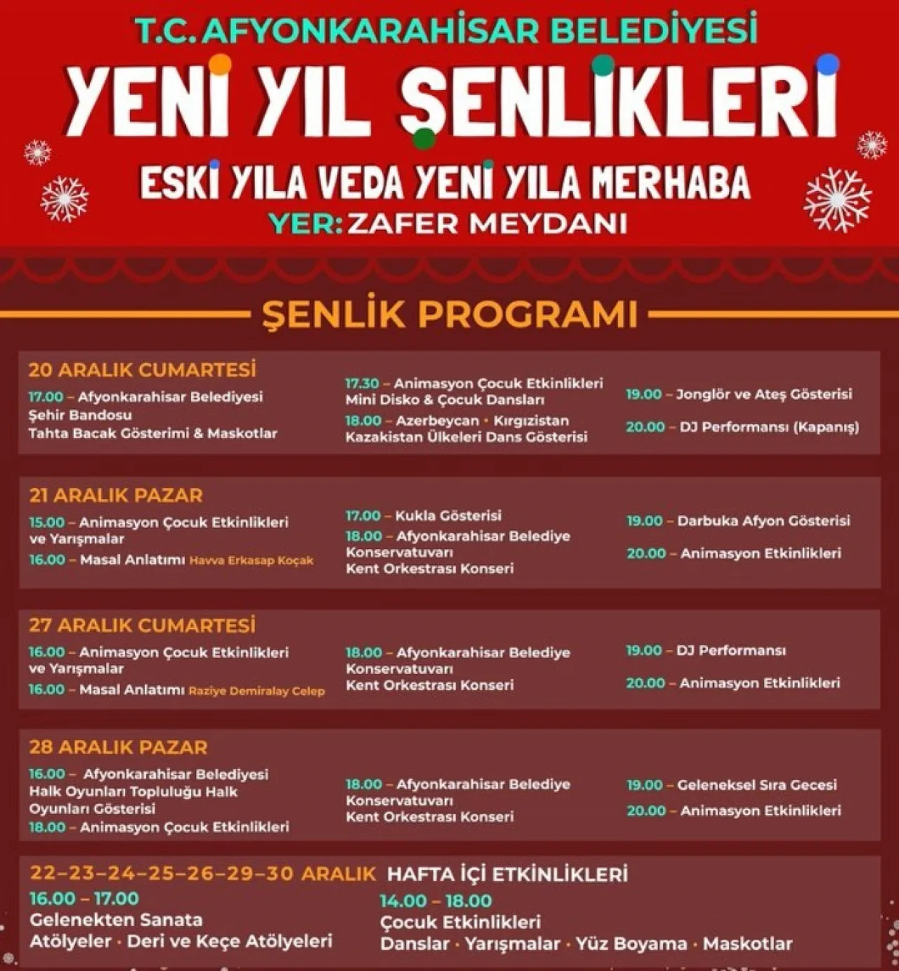 Afyonkarahisar Belediyesi tarafından Yeni Yıl Şenlikleri düzenlenecek. Programın 10 güne yayılması dikkat çekti