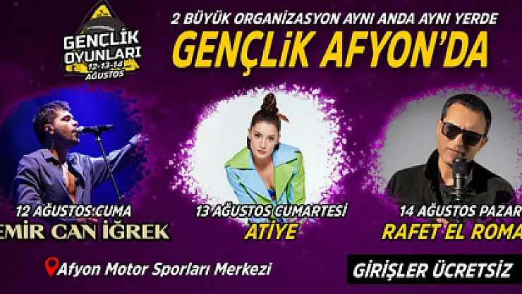 Afyonkarahisar Valiliği, Afyonkarahisar Belediyesi ve Gençlik ve Spor İl Müdürlüğü tarafından organize edilen 100. Yıl kutlamalarına dahil edilen Gençlik Oyunları 12-14 Ağustos tarihleri arasında yapılacak