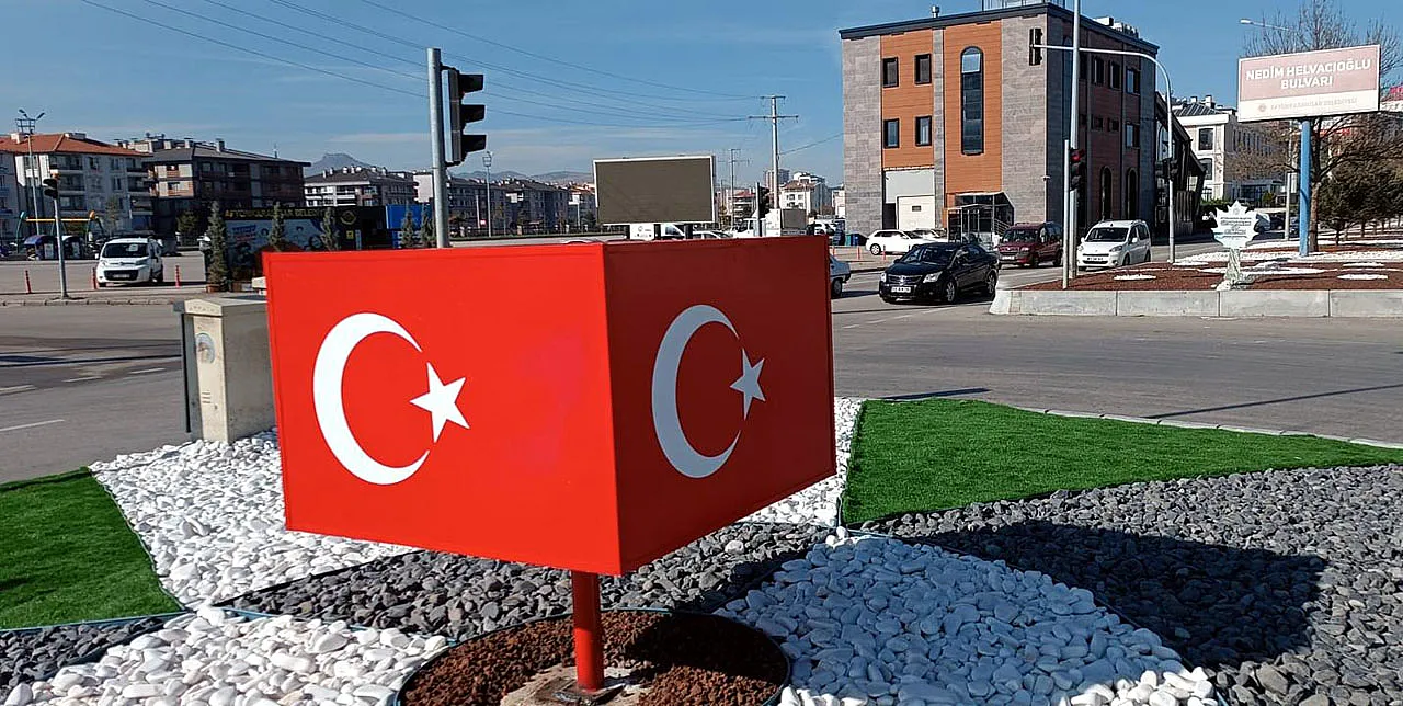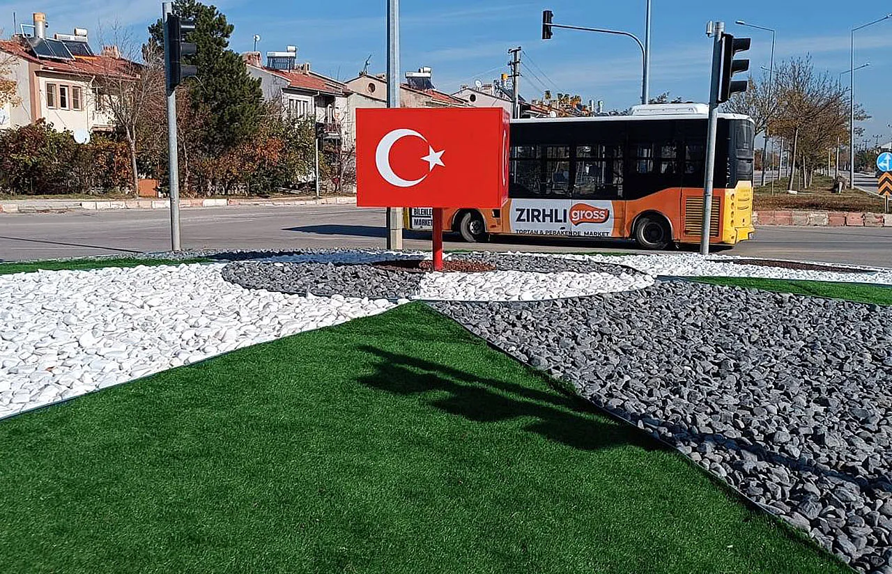 Afyonkarahisar Belediyesi tarafından şimdi de Cahar Dudayev Caddesi ile Nedim Helvacıoğlu Bulvarı kesişimindeki kavşakta düzenleme yapıldı. Su gerektirmeyen kuru peyzajla düzenlenen kavşaktaki Türk Bayrağı dikkat çekti.