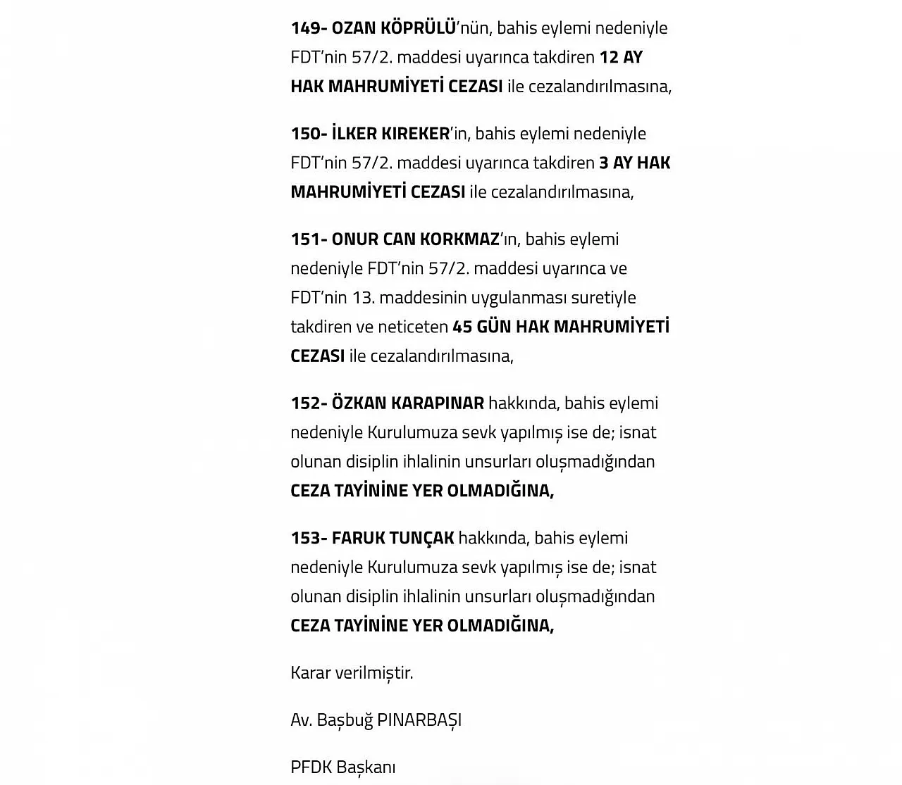 Bahis iddiaları kapsamında TFF Disiplin Kurulu'na sevk edilen Afyonkarahisar İl Hakem Kurulu Başkanı Özkan Karapınar'ın dosyası iki ayrı incelemeden geçti. Yapılan değerlendirmeler sonucunda Karapınar hakkında herhangi bir suç unsuruna rastlanmadığı TFF tarafından kamuoyuna duyuruldu.