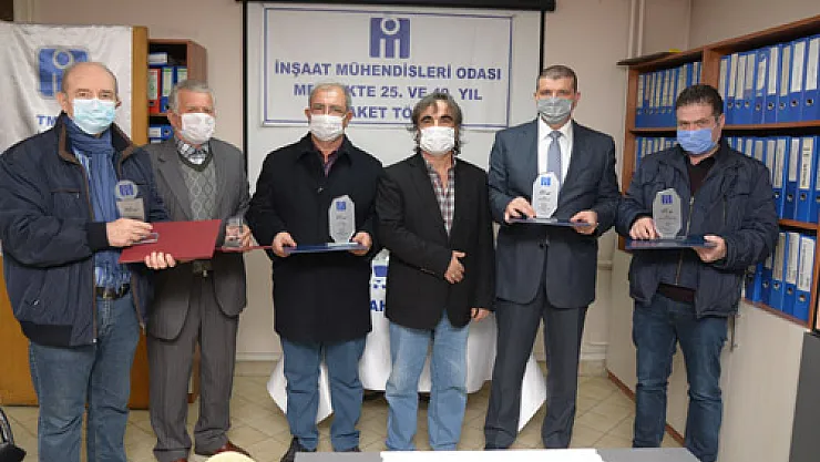 Meslekte 25 yılını dolduran üyeler; Kazım Çeşeay, Murat Bilgili, İlyas Mert’, Bilal Büyüközsoy ile meslekte 40 yılını dolduran oda üyeleri; Coşkun Kıl, Mehmet Kutlutürk, İrfan Sepin, Hayri Güven, Abdil Avşar, Mustafa Caner, Enver Eren, Abdullah Kundak, Ceyhun Ceylan, Ahmet Çobanoğlu’na plaketleri verildi. Meslekte 50. yılını dolduran İMO Üyeleri Necip Taşpınar ile Zekai Ütebay, Sabahattin Demirsoy, Münir Bilgili ile meslekte 60. yıla ulaşan Hulusi Diler’de plaketlerini aldı. >> Burcu AYDIN’ın Haberi