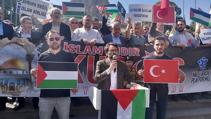 Duanın ardından açıklama yapan Eğitim Bir Sen Şube Başkanı Mustafa Arslan, Filistin için birlik olma zamanı olduğunu belirterek, “Selam olsun, Kudüs’e, Ramallah’a, El Halil’e, selam olsun, Gazze’ye, Nablus’a Cenin’e ve binler selam olsun Hamas’a… Yıllardır bu meydanlarda İsrail’in zulümlerini tel’in için toplandık. Zalimlere karşı nefretimizi haykırdık. Kardeşlerimizin acısını yüreğimizde hissederek duaya durduk, kıyama kalktık. Fakat bugün, büyük bir sevincin, Kudüs’ün, Mescid-i Aksa’nın özgürlüğüne giden yolda elde edilen mesafeyi, başarıyı kutlamak, Filistinli kardeşlerimizle omuz omuza olduğumuzu haykırmak için buradayız. Filistinler, işgalci Siyonist terör şebekesi İsrail’e karşı en etkili ve sarsıcı askeri harekâtlardan birini başlattı. Aksa Tufanı işgalcileri, zalimleri işgal ettikleri topraklardan silip süpürecek kadar büyük bir harekât. İlk kıblemiz, etrafı mübarek kalınmış Mescidi Aksa’mız, her gün terörist İsrail ve Yahudi işgalciler tarafından düzenlenen baskınlarla taciz ve tahkir ediliyorken, sokaklarda masum siviller kurşuna diziliyorken, on yaşında çocuklar tutuklanıyorken, Gazze’de ambargo ve abluka şiddetini artırmışken, sadece Filistinli kardeşlerimizin değil tüm Müslümanların izzeti her gün her an çiğnenmeye devam ediyorken gerçekleşen bu operasyon, yalnız İsrail’e değil, dünyayı kana boğan tüm zalimlere verilmiş bir cevaptır. Yıllardır işgal güçlerinin saldıkları sonucu binlerce Filistinli şehit edildi. Çok sayıda Filistinli yaralandı ve sakat bırakıldı. Binlerce Filistinlinin evleri ve arazileri hukuksuz bir şekilde işgal edildi. Gazze’nin etrafına örülen utanç duvarları ile son yüzyılın en büyük açık hava hapishanesi inşa edildi. İsrail‘in hukuksuz ablukası ve işgali nedeniyle yıllarca Filistinliler kendi topraklarında esir olarak hayat mücadelesi veriyorlar. İsrail bölgede bulunan bütün ülkelerle siyasi ve ekonomik bir yakınlaşma kurarak kendine bir koruma kalkanı oluşturmaya çalıştı Ayni zamanda Cenin ‘de, Nablus’ta ve Gazze’de çok sayıda katliam gerçekleştirdi.” dedi.