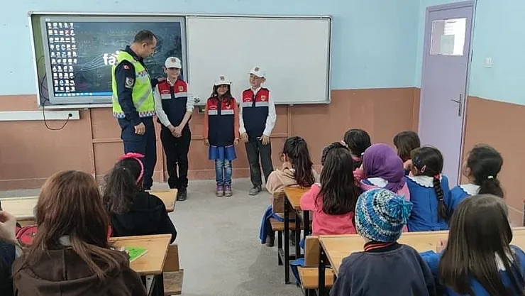 Afyonkarahisar’ın Bolvadin ilçesinde jandarma ekipleri ilköğretim okulunda çocuklara servis araçlarının nasıl kullanılması gerektiği konusunda bilgilendirme yaptı