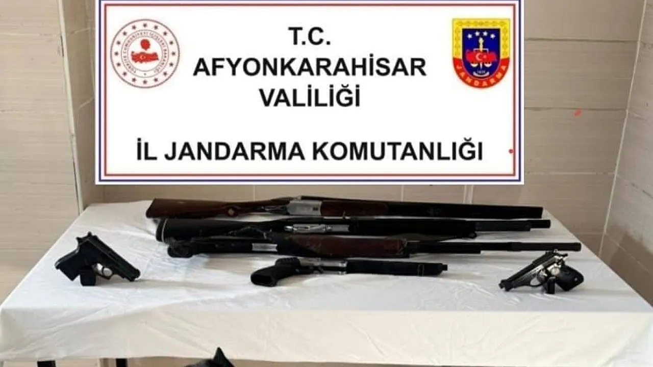 Afyonkarahisar İl Jandarma Komutanlığına bağlı ekipler tarafından yürütülen çalışma sonucu; Bir adet ruhsatsız tabanca, 3 adet ruhsatsız av tüfeği, 1 adet ruhsatlı av tüfeği, 1 adet ses ve gaz tabancası (kuru sıkı) yakalandı.