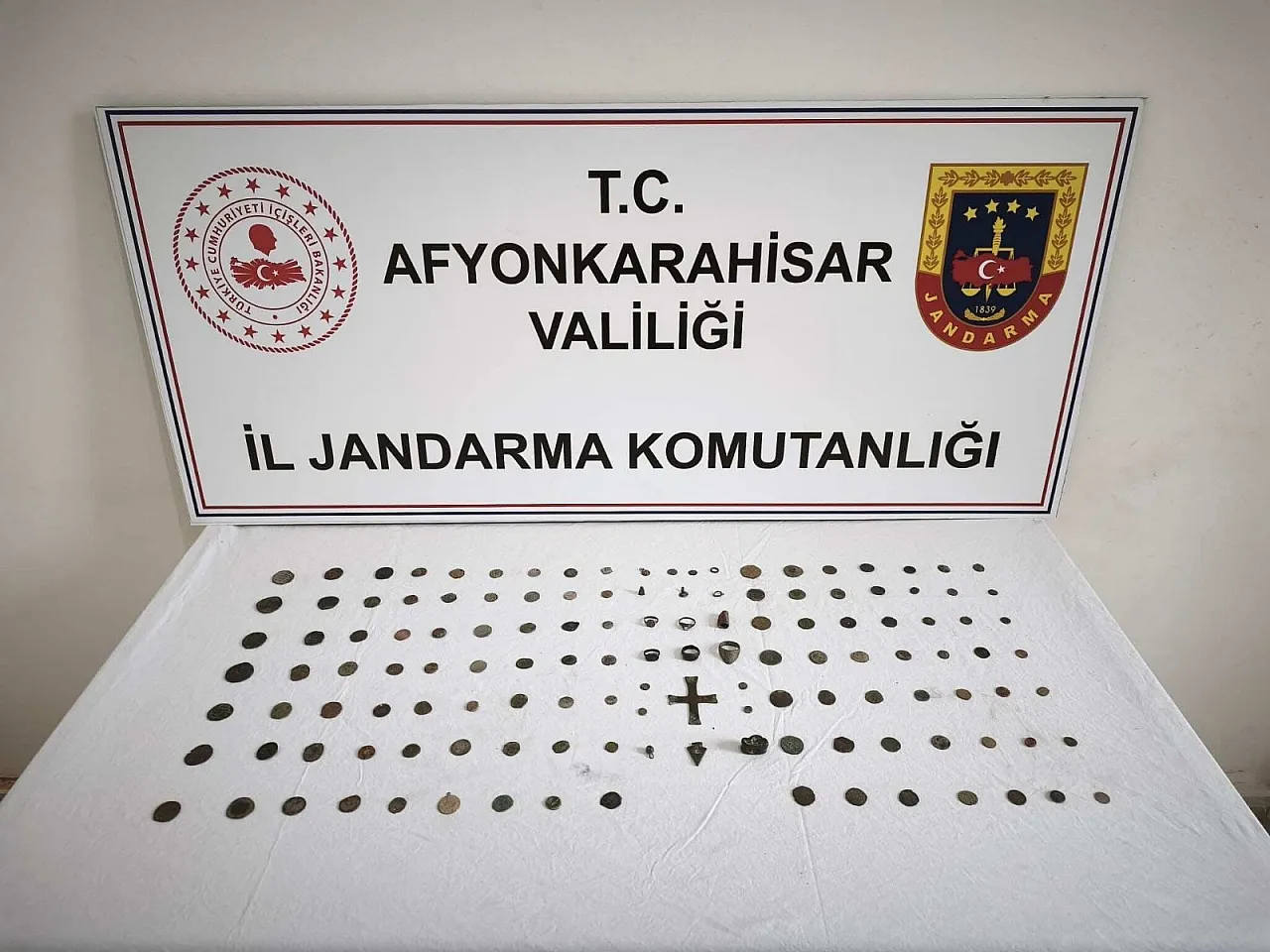 Afyonkarahisar İl Jandarma Komutanlığına bağlı ekipler; İhsaniye ilçesinde adli makamlardan alınan arama kararı doğrultusunda yaptıkları aramada; 133 adet eski eser niteliği taşıdığı düşünülen sikke ve objeler ele geçirildi.