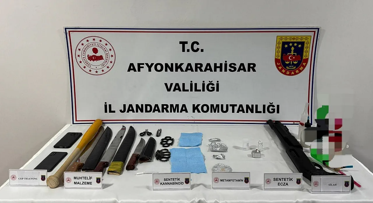 Afyonkarahisar İl Jandarma Komutanlığınca uyuşturucuyla mücadele kapsamında icra edilen titiz çalışmalar neticesinde; 5990 Kullanımlık Sentetik Kannabinoid, 3 Gram Satışa Hazır 5 Fişek Halinde Metamfetamin, 1 Adet Sentetik Ecza, 6 Adet Uyuşturucu Madde Kullanma Aparatı, 1 Adet Ruhsatsız Av Tüfeği, 6 Adet Cep Telefonu ele geçirildi.