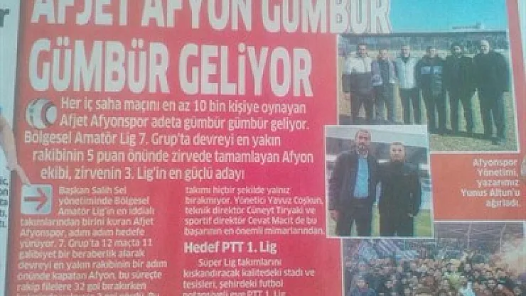 Bölgesel Amatör Lig 7. Grup’ta mücadele eden AFJET Afyonspor ulusal basında yer almaya başladı. Fanatik Gazetesi Yazarları’ndan Yunus Altun Afyonkara-hisar’a gelerek AFJET Afyonspor’un Serik Belediyespor’u ağırladığı maçı takip etti. Maçtan sonra Fanatik Gazetesi’nde Afyonspor’un haberine geniş yer veren Altun taraftara da dikkat çekti. Afyonspor’u 3. Lige aday isimlerin başında geldiğine dikkat çeken Altun AFJET Afyonspor’dan övgü dolu sözlerle bahsetti. AFJET Afyonspor Başkanı Salih Sel’i ve AFJET Genel Müdürü Yusuf Ulutürk’ü, Yönetim Kurulu Üyesi Yavuz Coşkun’u, Teknik Direktör Cüneyt Tiryaki ve Sportif Direktör Cevat Macit’i de kaleme alan Altun, tesislere, şehirdeki futbol potansiyeline ve AFJET Afyonspor’un ekonomik gücünden bahsetti. (Kocatepe Haber Merkezi)