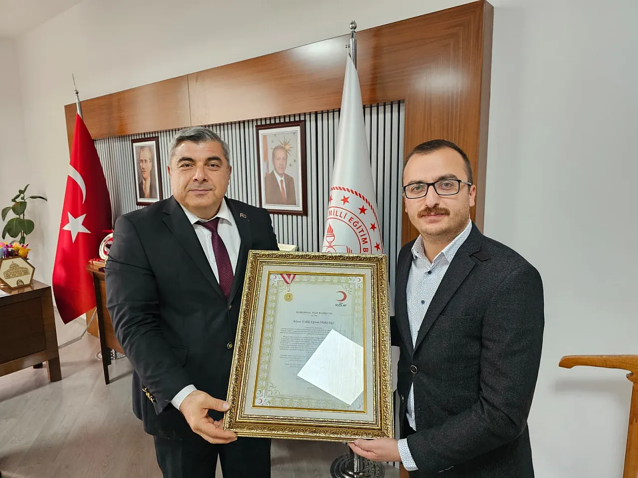 Afyonkarahisar İl Milli Eğitim Müdürü Miraç Sünnetci'ye, Türk Kızılay Afyonkarahisar Kan Bağış Merkezi Müdürü Dr. İsa Özcan tarafından kan bağışı kampanyalarındaki başarılarından dolayı madalya ve plaket takdim edildi.