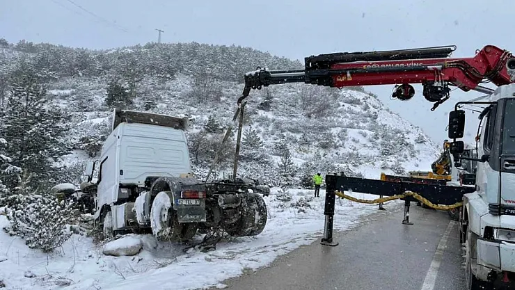 Afyonkarahisar'ın Emirdağ ilçesinde kar yağışı nedeniyle kontrolden çıkan tır ormanlık alana devrildi. Sürücünün hafif şekilde yaralandığı kazada, devrilen tır ağaçların arasından vinç yardımıyla çıkarıldı. Olay, Emirdağ ilçesi Doğanay köyü yakınlarından meydana geldi. Edinilen bilgilere göre, sürücüsünün ismi henüz belirlenemeyen 42 FEL 07 plakalı tır kara yağışı nedeniyle sürücüsünün direksiyon hakimiyetini kaybetmesi sonucu kontrolden çıktı. Tır, [&hellip]