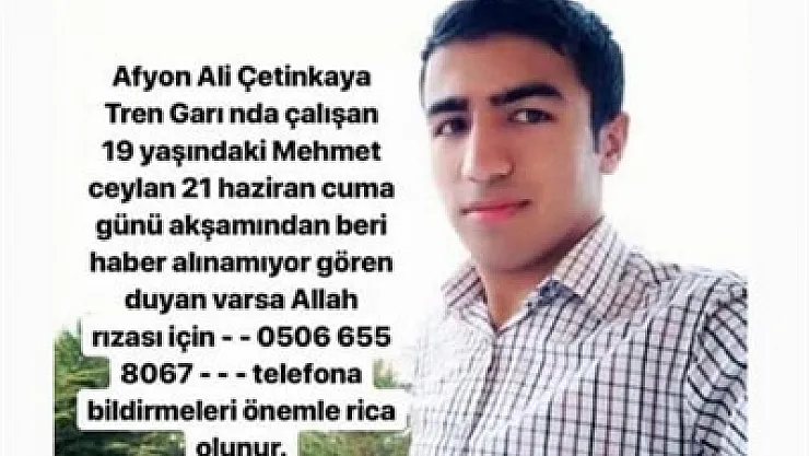 19 yaşındaki Mehmet Ceylan isimli gençten önceki günden bu yana haber alınamayınca yakınları her yerde onu aramaya başladılar. Geçtiğimiz cuma gecesi saat 23.00’den itibaren kayıplara karışan Mehmet Ceylan’ın tren garında çalıştığı öğrenildi. Yakınları tarafından sosyal medya başta olmak üzere tüm ilitişim kanalları aracılığıyla aranmaya devam eden Mehmet Ceylan’dan haber alan ya da görenlerin 0.505.277 19 75 numaralı telefona bilgi vermeleri isteniyor. >> Esra KÜÇÜKKURT’un Haberi