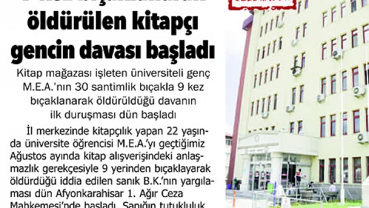 Afyonkarahisar 1. Ağır Ceza Mahkemesi 1. Heyetince kitap mağazası işleten üniversiteli genç M.E.A.’yı 9 kez bıçaklayarak öldürdüğü iddiasıyla yargılanan sanık B.K’nın davası karara bağlandı. Mahkeme heyeti oybirliği ile sanığın üzerine atılı kasten öldürme suçunu sabit görerek müebbet hapis cezasına hükmetti
