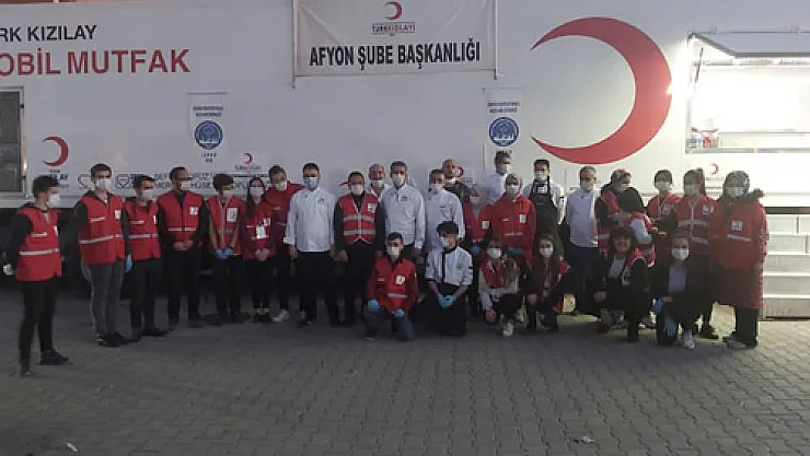 Türk Kızılay Afyonkarahisar Şube Başkan Fatih Okyar öncülüğünde 25 gönüllü bölgede görev yapan personelin yemek ihtiyacını karşılamak için afet bölgesine gitti. Okyar, depremzedelere yardım eden 112, AFAD, UMKE, AKUT başta olmak üzere yardım çalışanlarına Afyonkarahisar’ın lezzetleriyle bir nebze olsun acıları hafifletmek için 6 aşçı, 5 aşçı yardımcısı ve 1 gıda mühendisiyle beraber bir öğünde bin kişiye beslenme hizmeti vermek için seyyar mutfak kurduklarını söyleyerek, “Önceliğimiz görev yapan personeller. Bir öğünde bin kişilik yemek verecek şekilde mutfağımızı kurduk. Her öğünde sıcak yemeği kurtarma ekiplerimize ulaştıracağız.” ifadelerini kullandı.