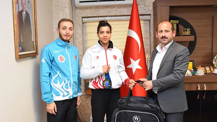 Dünya Büyükler Kick Boks Şampiyonasında 60 kg kategorisinde Dünya 3’üncüsü olan milli sporcu Kübra Kocakuş Gençlik ve Spor İl Müdürü Feyzullah Dereci’yi makamında ziyaret etti