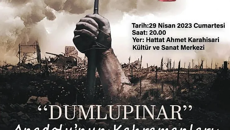 İl Kültür ve Turizm Müdürlüğü’nden yapılan açıklamada Kütahya Muharip Gaziler Derneği tarafından organize edilen ‘Dumlupınar Anadolu’nun Kahramanları’ adlı tiyatro oyununun Afyonkarahisar’da da sergileneceği kaydedildi. Oyunun 29 Nisan 2023 Cumartesi günü saat 20.00’de Hattat Ahmet Karahisar-i Kültür ve Sanat Merkezinde sahneleneceği belirtilirken, aynı zamanda ücretsiz sahnelenecek tiyatro oyununa tüm vatandaşların davetli olduğu ifade edildi.