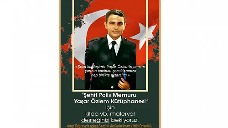 Sandıklı ilçesinde kurulması için çalışmalara başlanan Şehit Polis Memuru Yaşar Özlem Kütüphanesi için kitap ve benzeri eşyaların bağışı bekleniyor   'Şehit kardeşimiz Yaşar Özlem’in anısını, yarının teminatı çocuklarımıza hep birlikte aktaralım' adı altında başlatılan kampanyaya bağışta bulunmak isteyenler Sandıklı Aktürkler İmam Hatip Ortaokulu'nda Aslı Coşkun ve Ali Eren'e ulaşabilirler. Bağışta bulunmak isteyenler 0.505.674 66 93 [&hellip]