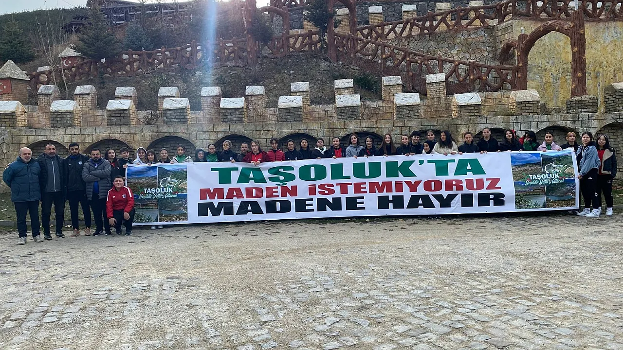 Taşoluk Belediye Spor Kadın Futbol Takımı ile İzmir Selçuk Çamlık Spor, Taşoluk’ta oynanan karşılaşma öncesinde doğamıza sahip çıkmak adına ‘Madene Hayır’ pankartı açarak çevre duyarlılığına dikkat çekti.