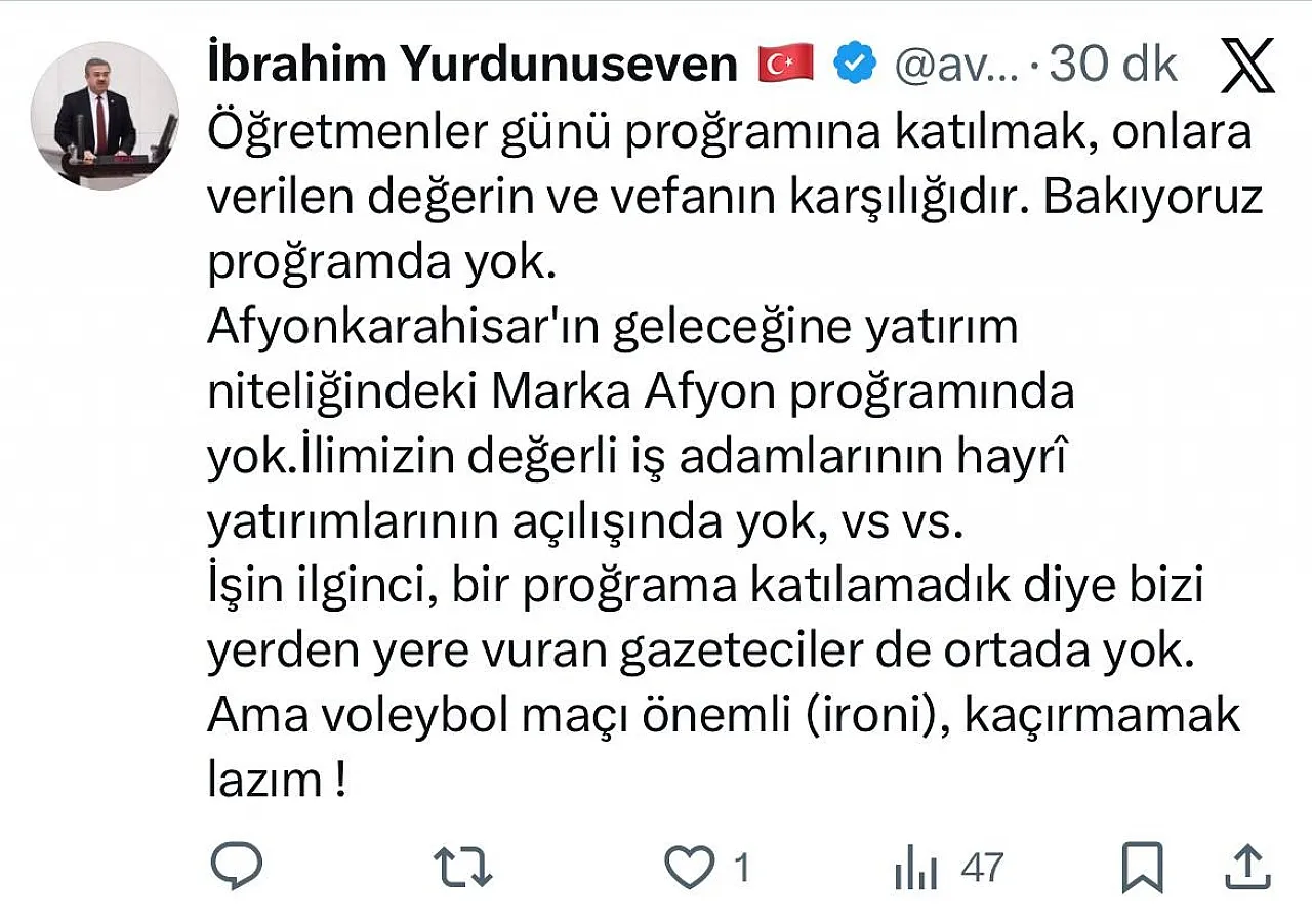 Yurdunuseven, "Öğretmenler Günü programına katılmak, onlara verilen değerin ve vefanın karşılığıdır. Bakıyoruz programda yok. Afyonkarahisar'ın geleceğine yatırım niteliğindeki Marka Afyon programında yok. İlimizin değerli iş adamlarının hayrî yatırımlarının açılışında yok, vs. vs. İşin ilginci, bir programa katılamadık diye bizi yerden yere vuran gazeteciler de ortada yok. Ama voleybol maçı önemli (ironi), kaçırmamak lazım!" dedi.