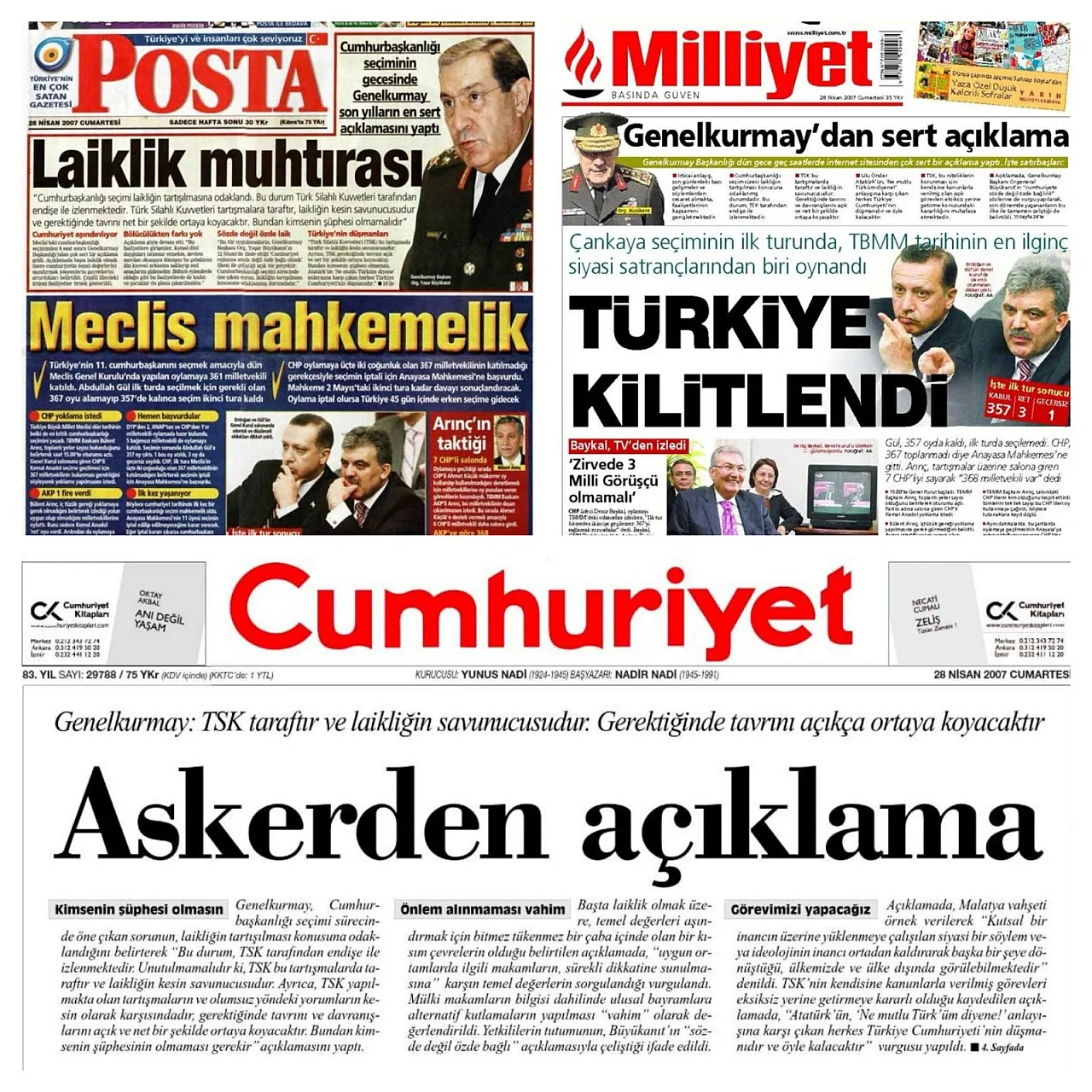 AK Parti Afyonkarahisar Milletvekili Dr. Hasan Arslan, ‘Milli İrade Geçilmez’ notuyla paylaştığı mesajda; 27 Nisan 2007’deki E-Muhtıra’yı destekler nitelikte yayın yapan bazı gazetelerin manşetlerine yer verdi. Milletvekili Arslan, “Tam 19 yıl önce bugünlerde, Türk demokrasisi yine bir "gece yarısı" karanlığına hapsedilmek istendi. 28 Şubat’ın o soğuk nefesini tarihe gömdüğümüz gibi, 27 Nisan e-muhtırasını da milletimizin sarsılmaz iradesiyle tarihin tozlu raflarına hapsettik!