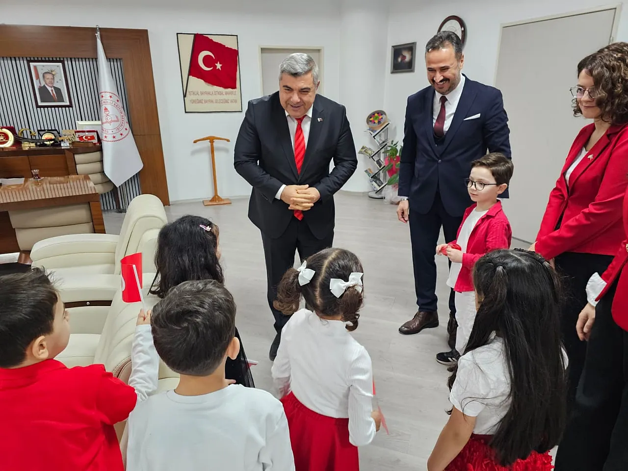 Asım Kocabıyık Anaokulu öğrencileri, millî birlik ve beraberliğimizin simgesi olan Türk Bayrağı’nı İl Milli Eğitim Müdürü Miraç Sünnetci’ye sevgi ve gururla takdim etti.