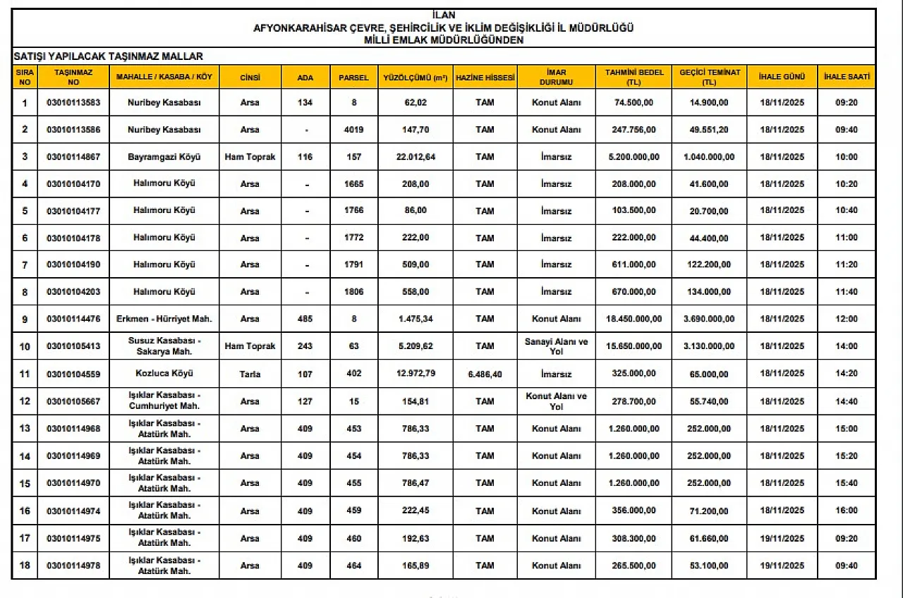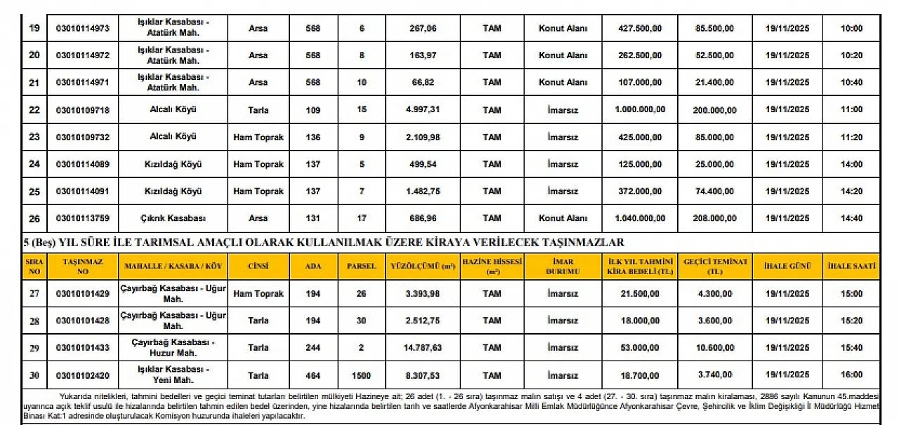 Afyonkarahisar Milli Emlak Müdürlüğü tarafından yapılan duyuruda; Nuribey, Halımordu, Erkmen, Susuz, Kozluca, Işıklar, Alcalı, Kızıldağ, Çıkrık ve Çayırbağ'da 26 taşınmazın satılacağı belirtildi. Duyuruda 4 adet taşınmazın da tarım amaçlı kiralama yöntemine gidileceği kaydedildi.