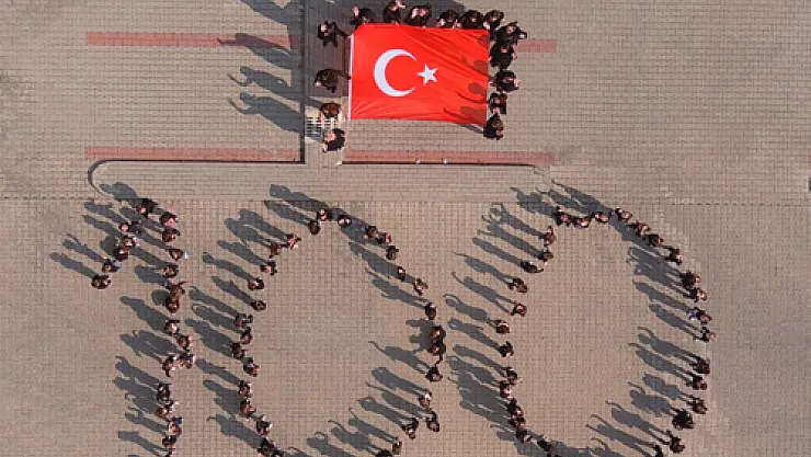Bozüyük'te minik öğrenciler tek yürek olarak '100' rakamını yazıp bayrak açtı, Cumhuriyet'in 100'üncü yılını kutladı.
