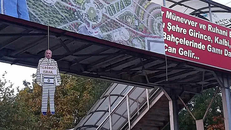 Afyonkarahisar şehir merkezinde kimliği belirsiz kişiler İsrail Başbakanı Netanyahu’nun maketini üst geçitten aşağıya sallandırdı. Netanyahu maketinin üzerine “Katil İsrail” yazıldı.