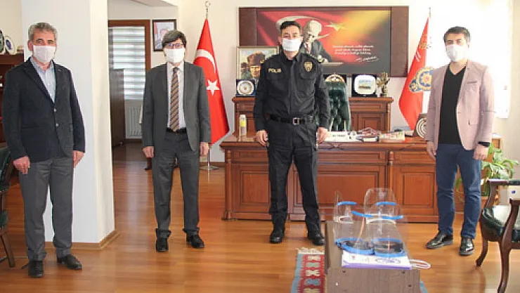 Sanat Merkezi öğrencileri ve öğretmenleri tarafından polisler için üretilen yüz koruycu siperlikler İl Emniyet Müdürü Ali Temiz’e teslim edildi