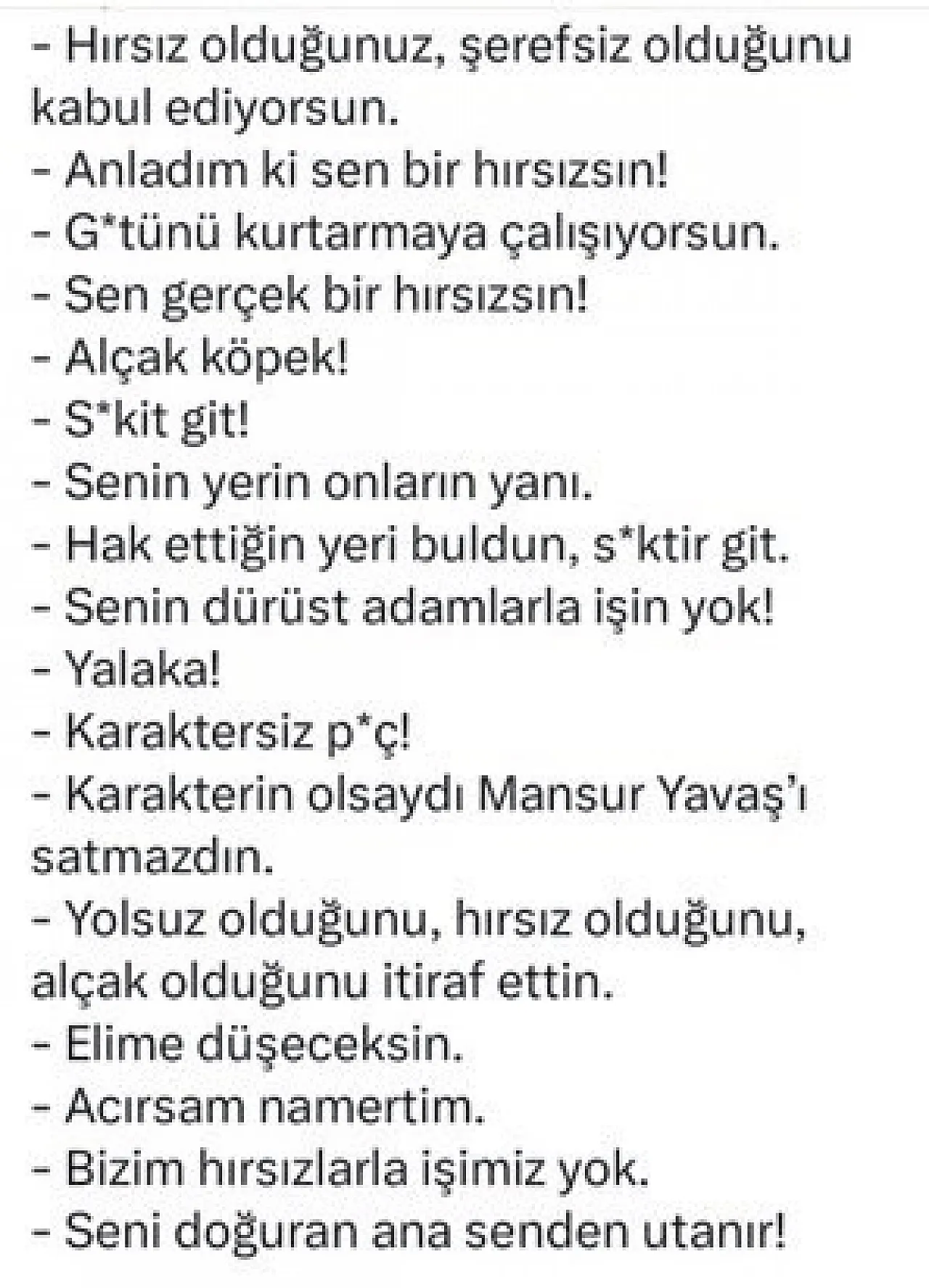 Soruyorum; Bir genel başkan, belediye başkanına küfür eder mi? Bir genel başkan, ailevi değerleri hedef alıp hakaret eder mi? Bir genel başkan, ağıza alınmayacak kelimelerle tehdit eder mi? Özellikle aile değerlerimi ve kutsal varlığım annem ve merhum babamın dahi karıştırıldığı mesajlar karşısında; Cumhuriyet Halk Partili seçmene olan saygım ve sevgim baki kalmak kaydı ile artık Cumhuriyet Halk Partisi saflarında hizmet etmem söz konusu dahi olamaz. Benim tek önceliğim Keçiören’e hizmet olmasına rağmen mesajlarda yer alan üslubun ve anlayışın hâkim olduğu bir zeminde, enerjimi ve mesaimi ilçemin sorunlarına odaklayarak sağlıklı bir şekilde görev yapmamın mümkün olmadığı kanaatine varmış bulunuyorum.