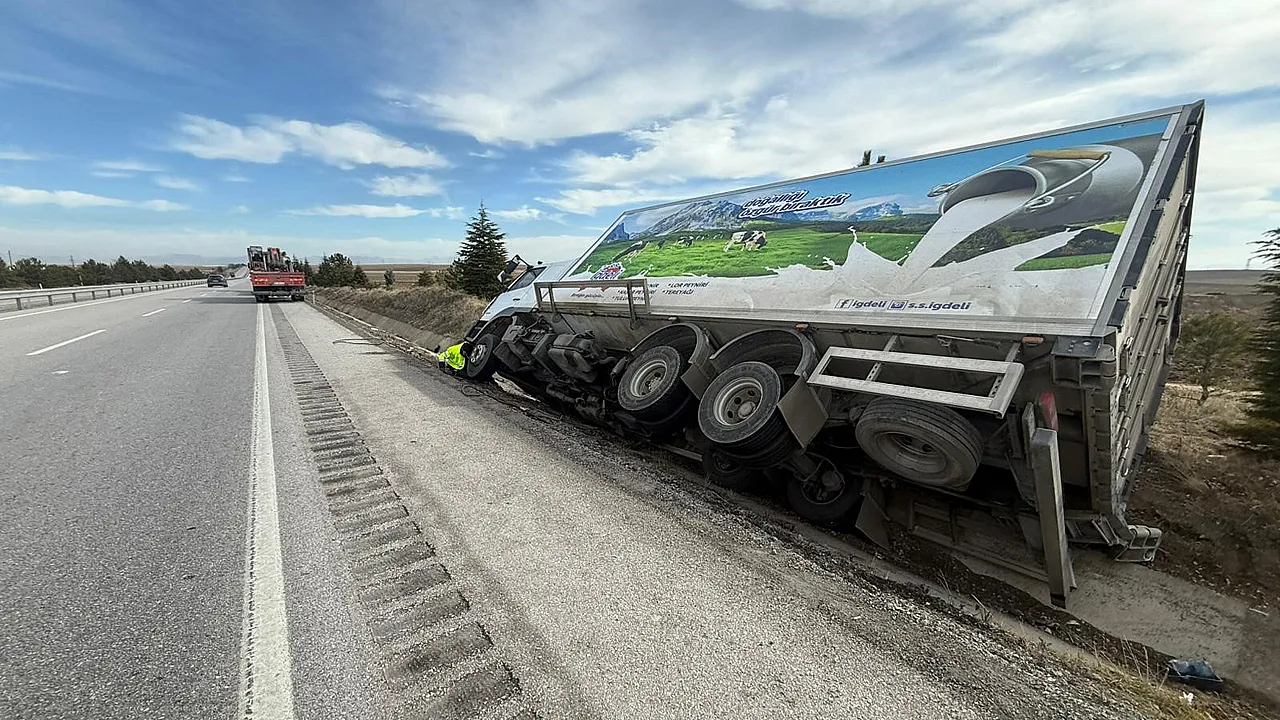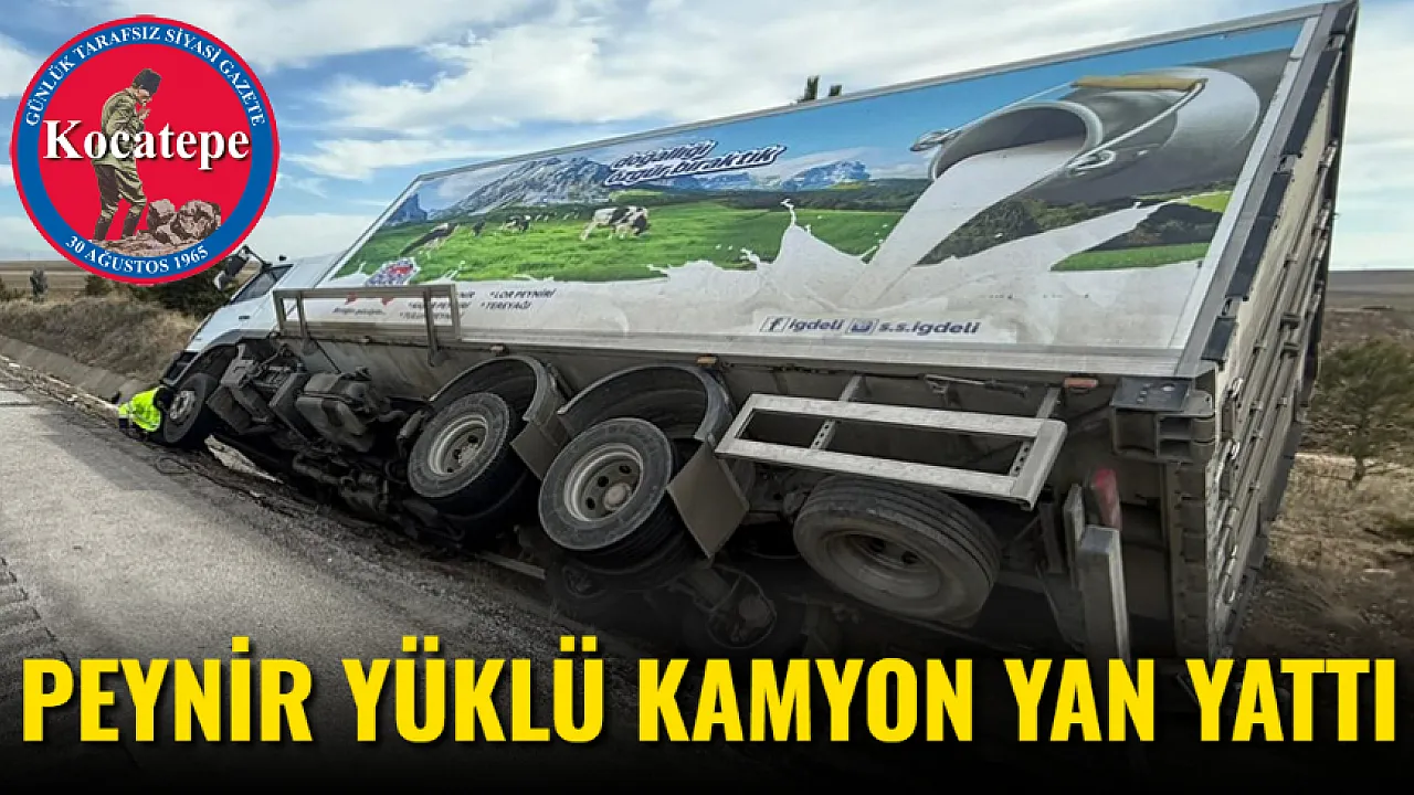 Afyonkarahisar'da kontrolden çıkan peynir yüklü bir kamyon refüje girerek yan yattı. Olayda ölen ya da yaralananın olmadı.