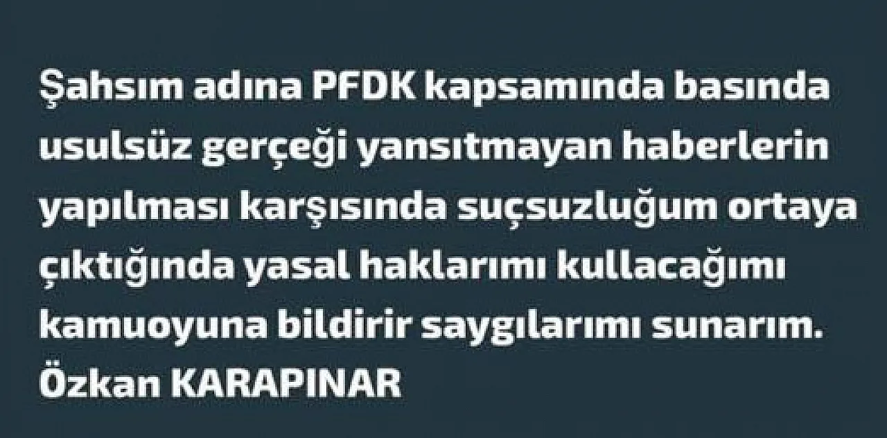 Profesyonel Futbol Disiplin Kurulu'na (PFDK) sevk edilmesinin ardından Karapınar, yazılı açıklama yaptı.