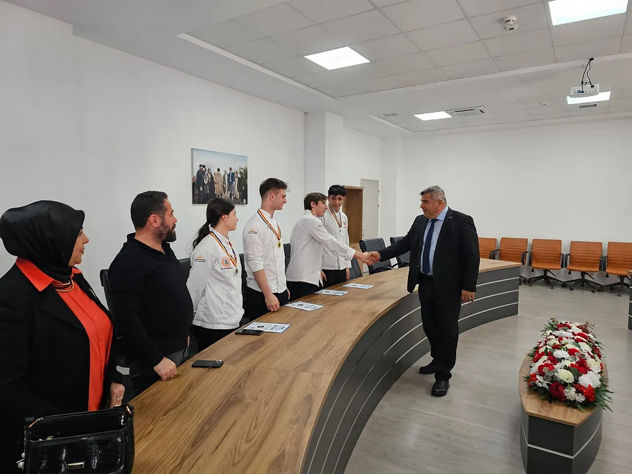 Yarışma sonrası yurda dönen öğrenciler İl Milli Eğitim Müdür Yardımcısı İbrahim Badak ve Şube Müdürü Mustafa Günay ile birlikte İl Milli Eğitim Müdürü Miraç Sünnetci’yi ziyaret etti.