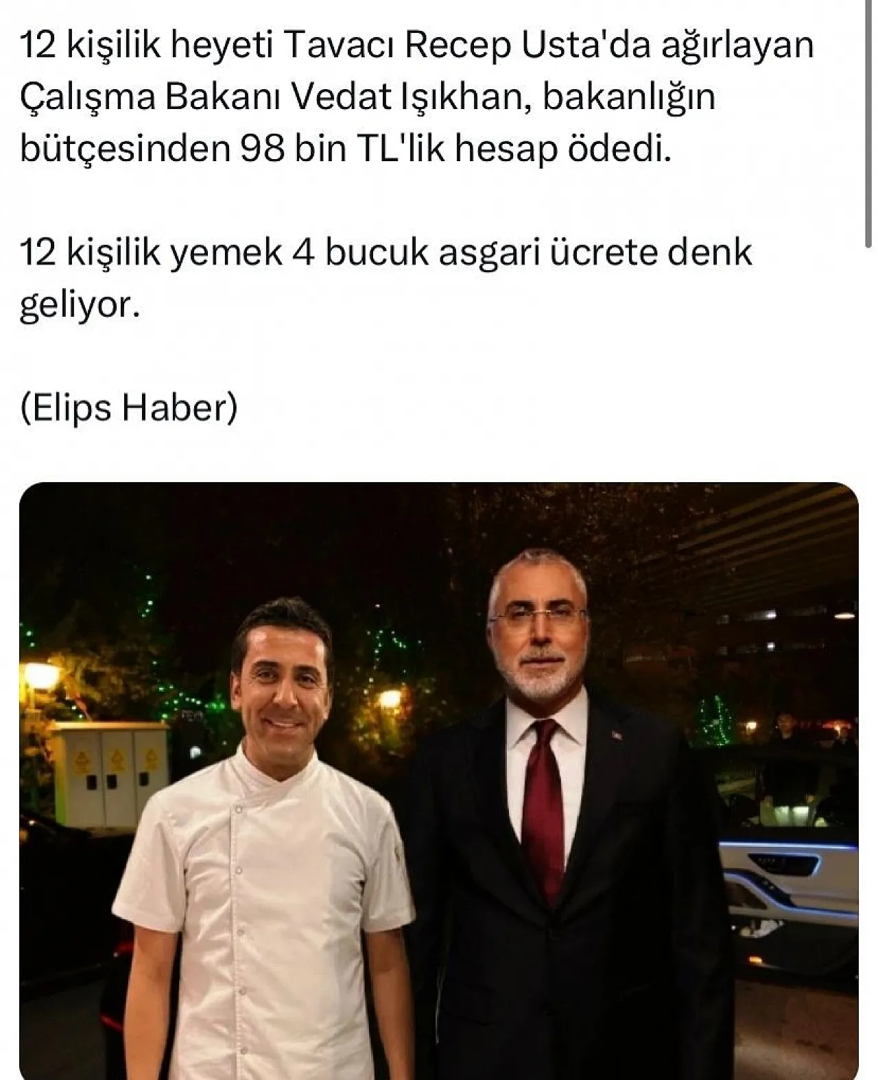 Karataş, "2026 için belirlenen asgari ücret; 28.075 liradır. Sayın Bakan'ın misafirleriyle yediği bir akşam yemeği ücreti; 97.909 lire Fıkra bu kadar!" diye konuştu.
