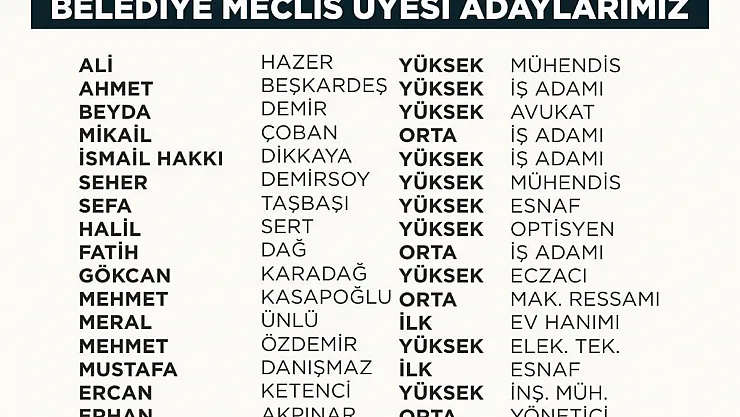 Afyonkarahisar’ın birçok kesiminden temsilcilerin dâhil edildiği listede Afyonkarahisar’da esnaf, öğrenci, kadın, engelliler, mühendis, eczacı, avukat gibi önemli sektörlerden isimlerin olduğu gözlendi. Saadet Partisi Afyonkarahisar Belediye Meclisi Üyeliği Adayları olarak şu isimler açıklandı: Ali Hazer Mühendis, Ahmet Beşkardeş İş Adamı, Beyda Demir Avukat, Mikail Çoban İş Adamı, İsmail Hakkı Dikkaya İş Adamı, Seher Demirsoy Mühendis, Sefa Taşbaşı Esnaf, Halil Sert Optisyen, Fatih Dağ İş Adamı, Gökcan Karadağ Eczacı, Mehmet Kasapoğlu Makine Ressamı, Meral Ünlü Ev Hanımı, Mehmet Özdemir Elektrik Teknikeri, Mustafa Danışmaz Esnaf, Ercan Ketenci İnşaat Mühendisi, Erhan Akpınar Yönetici, Laika Korkmaz Ev Hanımı, Fatıma Candan Ev Hanımı, Muammer Gökmen Esnaf, Hümeyra Çakır Ev Hanımı, Melike Beril Kantürk Yönetici, Hasan Çelik Yüksek Esnaf, Hanife Zengin Ev Hanımı, Mehmet Yazlı Serbest Meslek, Firdevs Akyüz Ev Hanımı, Emine İslen Ev Hanımı, İsmail Furkan Öztürk Öğrenci. Kontenjan Adayları: Hamza Gümüşkanat Esnaf, Adnan Şenel Esnaf, Mevlüt Yeşil Avukat, Recep Candan Emekli.