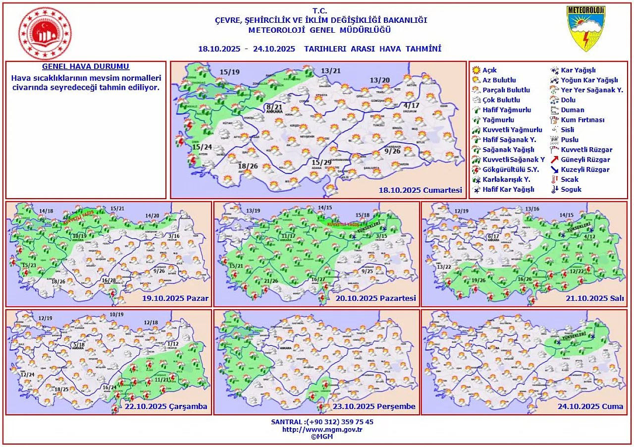 Meteoroloji Genel Müdürlüğü tarafından yapılan tahminlere göre: Ülkemizin kuzeybatı kesimlerinin parçalı yer yer çok bulutlu, Marmara, Ege'nin kuzey kıyıları ve Batı Karadeniz'in batısının sağanak yağışlı, diğer yerlerin parçalı ve az bulutlu geçeceği tahmin ediliyor. Orta ve Doğu Karadeniz'in iç kesimlerinde pus ve yer yer sis görülmesi bekleniyor.
