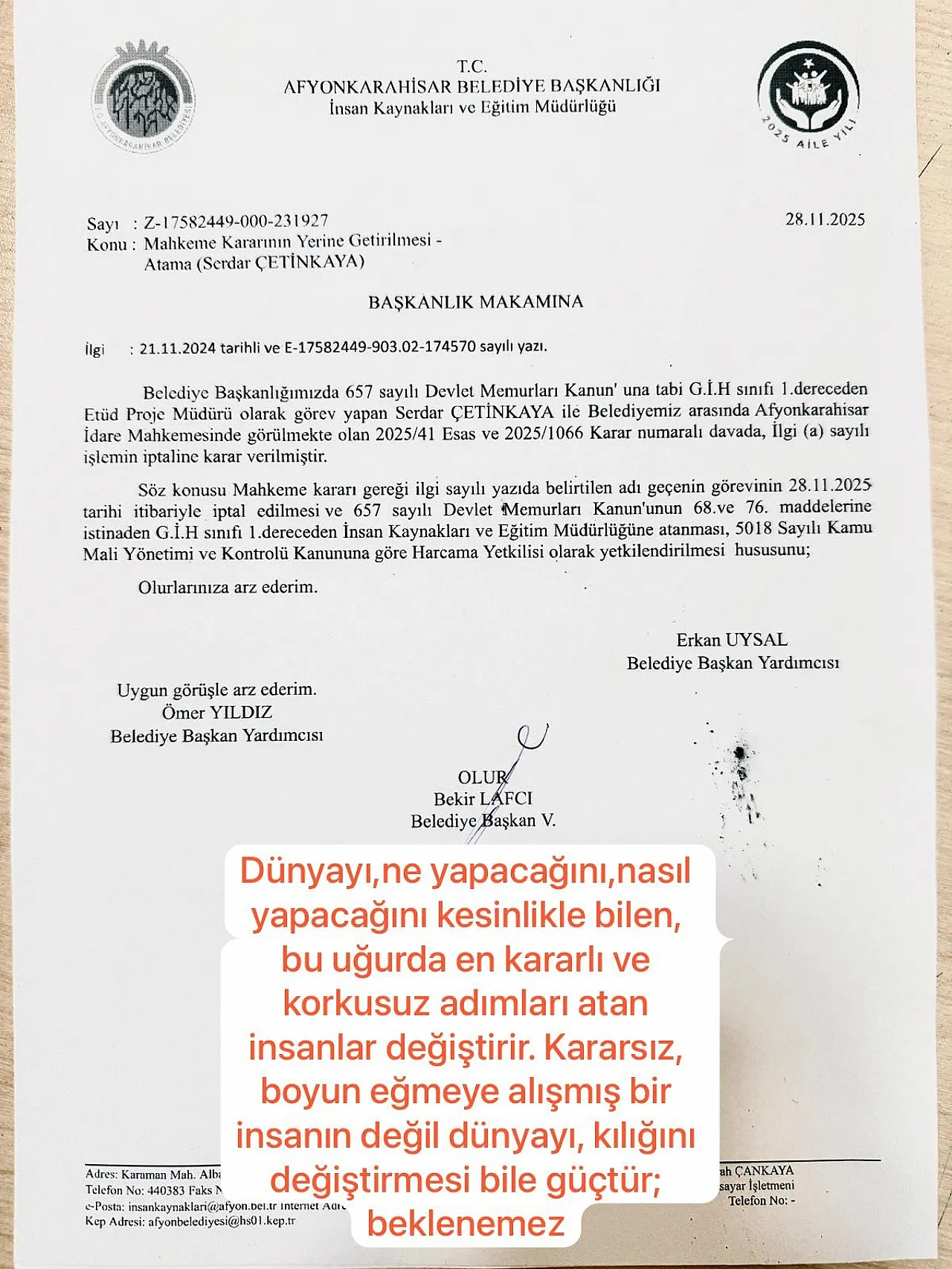 Aynı zamanda Bem-Bir Sen İl Temsilcisi olan Serdar Çetinkaya’nın göreve iade yazısı Afyonkarahisar Belediyesi tarafından resmi olarak yazıldı. Belediye Başkan Yardımcıları Erkan Uysal ve Ömer Yıldız’ın imzalarıyla Başkanlık Makamı’na yazılan atama yazısında “Belediye Başkanlığımızda 657 sayılı Devlet Memurları Kanun' una tabi G.İ.H sınıfı 1.dereceden Etüd Proje Müdürü olarak görev yapan Serdar Çetinkaya ile Belediyemiz arasında Afyonkarahisar İdare Mahkemesinde görülmekte olan 2025/41 Esas ve 2025/1066 Karar numaralı davada, İlgi (a) sayılı işlemin iptaline karar verilmiştir. Söz konusu Mahkeme kararı gereği ilgi sayılı yazıda belirtilen adı geçenin görevinin 28.11.2025 tarihi itibariyle iptal edilmesi ve 657 sayılı Devlet Memurları Kanun'unun 68.ve 76. maddelerine istinaden G.İ.H sınıfı 1.dereceden İnsan Kaynakları ve Eğitim Müdürlüğüne atanması, 5018 Sayılı Kamu Mali Yönetimi ve Kontrolü Kanununa göre Harcama Yetkilisi olarak yetkilendirilmesi hususunu; Olurlarınıza arz ederim” denildi.
