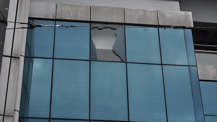 Eskişehir'de şiddetli rüzgâr sonucu kent merkezindeki yüksek katlı bir binanın adeta tuzla buz olan camı küçük parçalar halinde yere düşerken, olayda şans eseri kimse yara almadı.